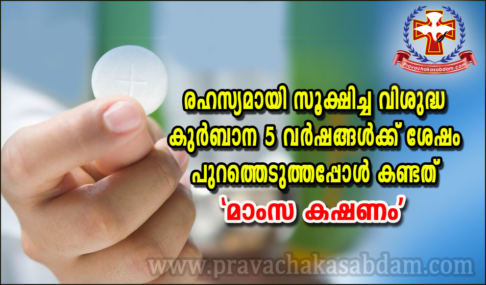 രഹസ്യമായി സൂക്ഷിച്ച വിശുദ്ധ കുര്ബാന 5 വര്ഷങ്ങള്ക്ക് ശേഷം പുറത്തെടുത്തപ്പോള് കണ്ടത് മാംസ കഷണം