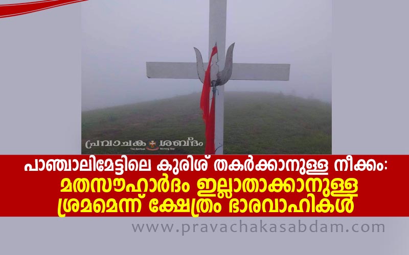 കാഞ്ഞിരപ്പള്ളി: പൂര്വ പിതാക്കന്മാരില് നിന്നു കൈവശം ലഭിച്ച പാഞ്ചാലിമേട് മരിയന് കുരിശുമല തകര്ക്കാനുള്ള ശ്രമം അപലപനീയമെന്നു തദ്ദേശവാസികള്. 1956ല് കുരിശുകള് സ്ഥാപിച്ച് കുരിശുമലയായി പ്രഖ്യാപിച്ചതാണ്. ദുഃഖവെള്ളിയാഴ്ചത്തെ പീഡാനുഭവ തിരുക്കര്മങ്ങള്ക്കുശേഷം വിശ്വാസികള് മരിയന് കുരിശുമലയിലേക്ക് കുരിശിന്റെ വഴി നടത്താറുണ്ട്. എതിര്വശത്തെ അമ്പലത്തിനും വര്ഷങ്ങളുടെ പഴക്കമുണ്ട്.