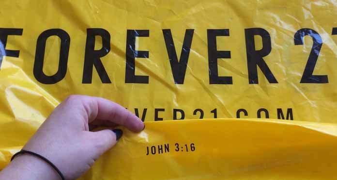 3. ഫോറെവർ 21: കൊറിയയിൽ നിന്നും അമേരിക്കയിലേക്ക് കുടിയേറിയവര് ആരംഭിച്ച കമ്പനിയാണ് ഫോറെവർ 21. അടിയുറച്ച ക്രൈസ്തവ വിശ്വാസികളായ ഡോൺ ചാങ്, ജിൻ ചാങ് തുടങ്ങിയവരാണ് റീട്ടെയിൽ വസ്ത്ര വ്യാപാരത്തെ നയിക്കുന്നത്. ഫോറെവർ 21 തങ്ങളുടെ ഉത്പന്നങ്ങള് വാങ്ങുന്നവര്ക്ക് നൽകുന്ന കവറുകളുടെ താഴെ 'യോഹന്നാൻ 3:16' (തന്റെ ഏകജാതനെ നൽകാൻ തക്കവിധം, ദൈവം ലോകത്തെ അത്രമാത്രം സ്നേഹിച്ചു) എന്ന് വ്യക്തമായി എഴുതിയിട്ടുണ്ട്.