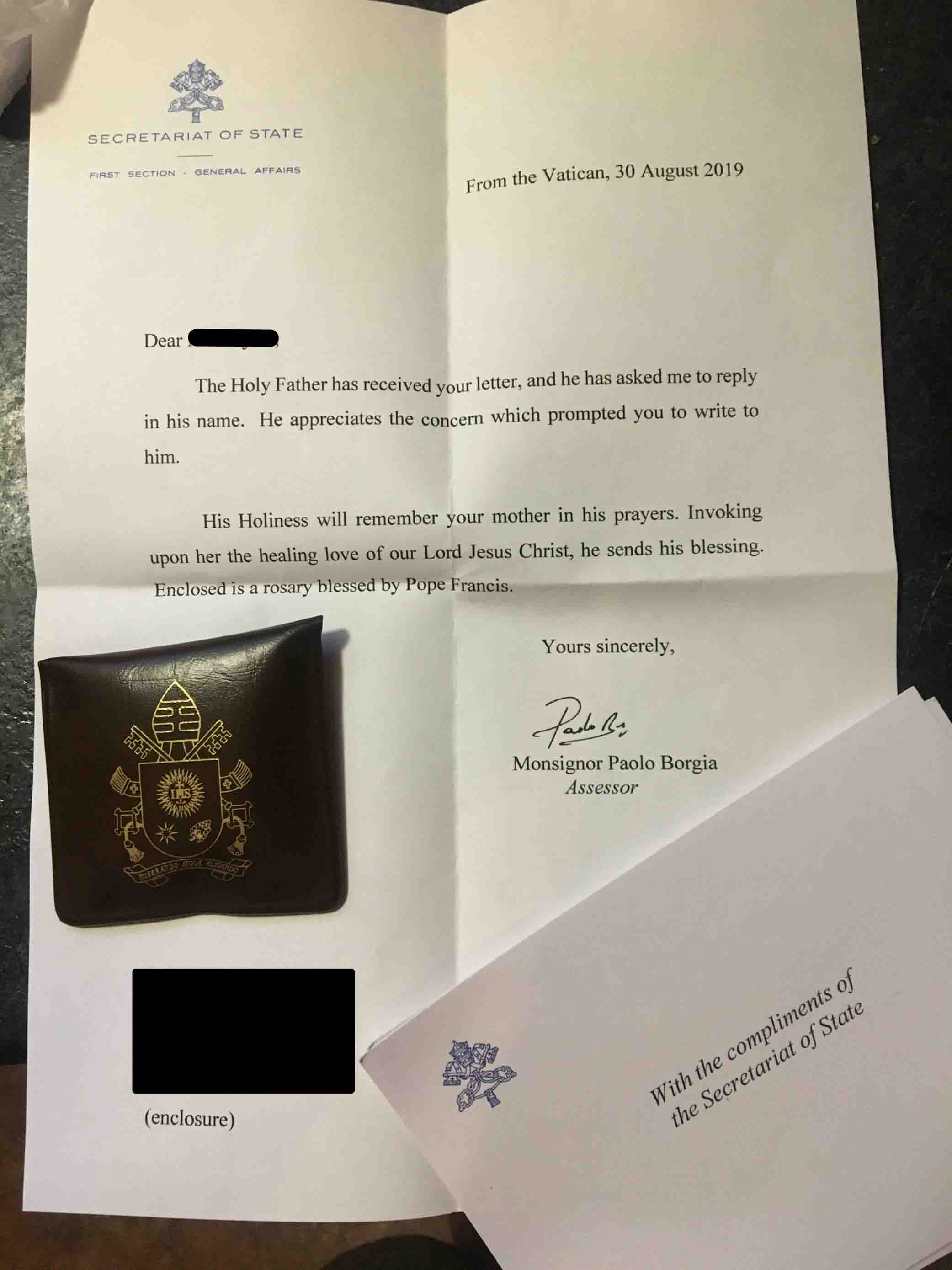 130 കോടി ജനങ്ങളുടെ തലവന് കേവലം ഒരു വിശ്വാസി കത്തയച്ചാല് അതിനു മറുപടിയോ? അസാധ്യമെന്ന് മുന്വിധി നടത്താന് വരട്ടെ. മറുപടി കിട്ടിയ വ്യക്തികളുമുണ്ട്. പ്രസ്തുത ലേഖനത്തിലെ, മാർഗനിർദ്ദേശങ്ങളനുസരിച്ച് മാർപാപ്പയ്ക്ക് കത്തയച്ച ഡേവിഡ് എന്നയാൾക്ക് മറുപടി ലഭിച്ചത് അടുത്തിടെയാണ്. ഒട്ടും പ്രതീക്ഷിക്കാതെ ലഭിച്ച മറുപടി ഡേവിഡിനെ അത്ഭുതപ്പെടുത്തി. ഒറ്റ പേജിലായാണ് ഡേവിഡ് കത്തെഴുതിയത്. തന്റെ അമ്മയ്ക്കുവേണ്ടി എന്തെങ്കിലും വാക്കുകൾ തിരികെ അയയ്ക്കണമെന്നായിരുന്നു കത്തിൽ അദ്ദേഹം അഭ്യർത്ഥിച്ചിരുന്നത്.