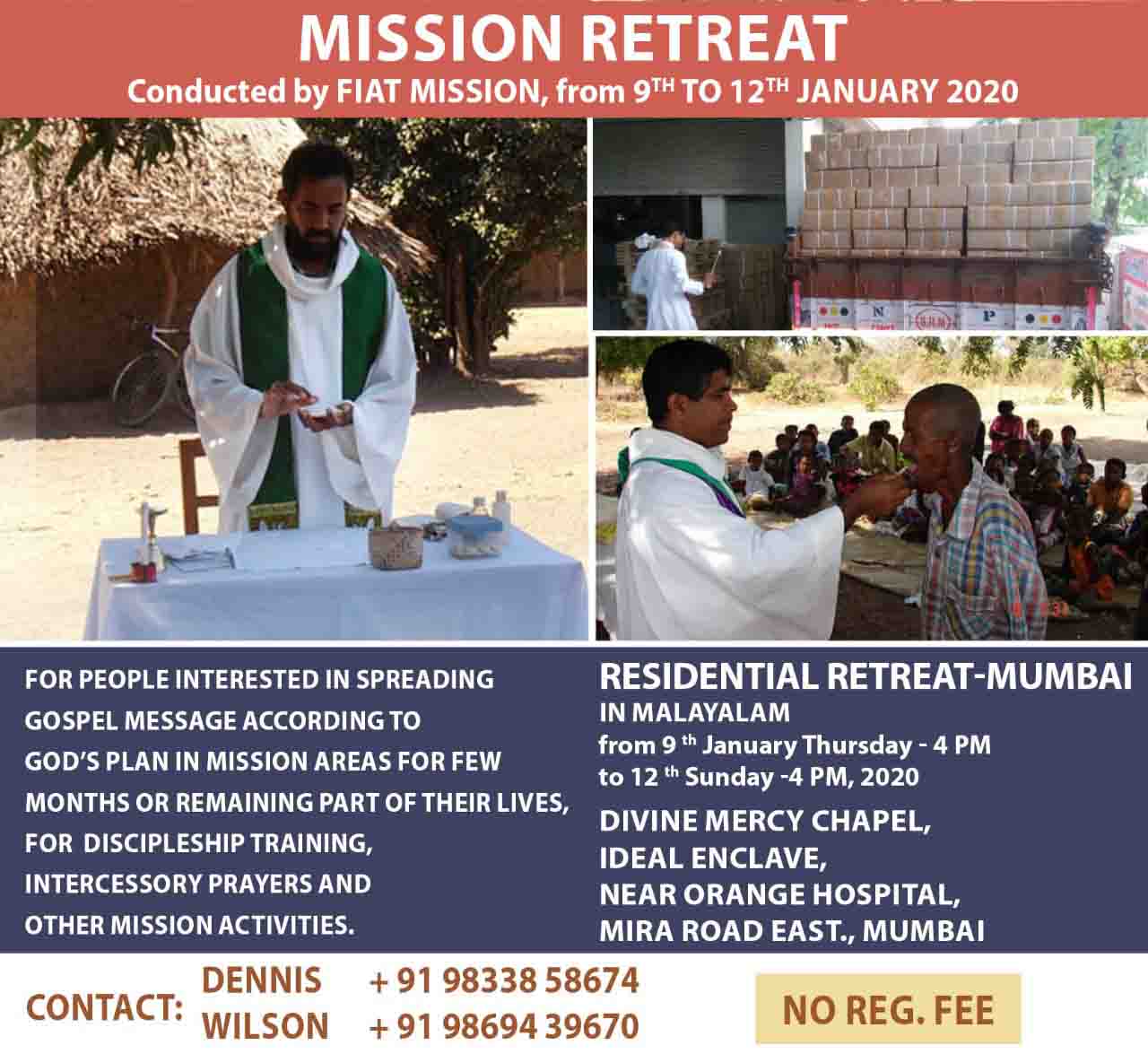 സുവിശേഷവത്ക്കരണം ലക്ഷ്യമാക്കി ദൈവരാജ്യ വളർച്ചക്കായി മിഷൻ വോളന്റിയേഴ്സിനെ ഒരുക്കുന്ന മിഷൻ ധ്യാനം മുംബൈയിൽ ഫിയാത്ത് മിഷൻ സംഘടിപ്പിക്കുന്നു. താമസിച്ച് ധ്യാനിക്കാവുന്ന ഈ ധ്യാനം 2020 ജനുവരി 9 മുതൽ 12 വരെയാണ് ഒരുക്കിയിരിക്കുന്നത്. മലയാളത്തിൽ ക്രമീകരിച്ചിരിക്കുന്ന ധ്യാനത്തിന് രജിസ്ട്രേഷൻ സൗജന്യമാണ്. മുംബൈ മീര ഈസ്റ്റ് റോഡിൽ ഓറഞ്ച് ഹോസ്പിറ്റലിനു സമീപമുള്ള ഡിവൈൻ മേഴ്സി ചാപ്പലിലാണ് ധ്യാനം.