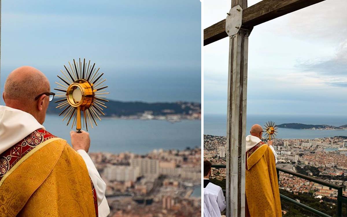 ടോളന്: കൊറോണ പകർച്ചവ്യാധിയുടെ പശ്ചാത്തലത്തിൽ ഫ്രാൻസിലെ ടോളനിലെ മലമുകളിൽ നിന്ന് ദിവ്യകാരുണ്യ ആശീർവ്വാദം നൽകിക്കൊണ്ട് ഫ്രഞ്ച് ബിഷപ്പ്. ഇന്നലെ ഉച്ചയോടെ കൂടിയാണ് ടോളൻ നഗരത്തിൽ നിന്ന് 584 മീറ്റർ ഉയരത്തിൽ സ്ഥിതി ചെയ്യുന്ന മോണ്ട് ഫാറോൺ മലമുകളിൽ നിന്ന് ബിഷപ്പ് ദിവ്യകാരുണ്യ ആശീർവ്വാദം നൽകിയത്.