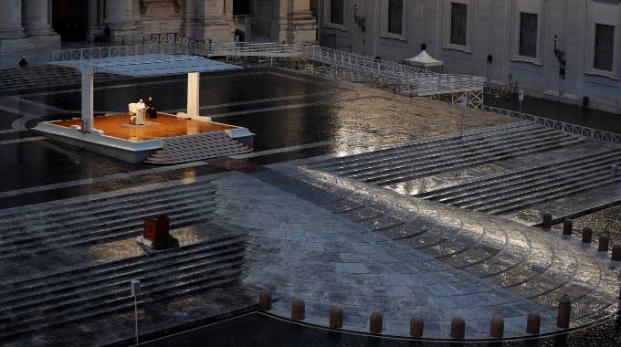 മഹാമാരിയില്നിന്ന് ലോകത്തെ രക്ഷിക്കാനുള്ള പാപ്പയുടെ പ്രാര്ത്ഥനായാമം ഇന്നലെ പ്രാദേശിക സമയം 6 മണിക്ക്, ഇന്ത്യയിലെ സമയം രാത്രി 10.30ന് തന്നെ ആരംഭിച്ചു. മഴപെയ്തൊഴിഞ്ഞ നിശബ്ദതയില് ലയിച്ചു നിന്ന അന്തരീക്ഷത്തിൽ, വത്തിക്കാന് സ്റ്റേറ്റ് സെക്രട്ടറി കര്ദ്ദിനാള് പിയട്രോ പരോളിനൊപ്പമാണ് സെന്റ് പീറ്റേഴ്സ് ബസിലിക്കയുടെ പൂമുഖത്ത് ക്രമീകരിച്ച വചനവേദിയിലേക്ക് ഫ്രാൻസിസ് പാപ്പ പ്രവേശിച്ചത്. യുവത്വത്തിന്റെ പ്രസരിപ്പോടെ മാത്രം കണ്ടിട്ടുള്ള പാപ്പയുടെ മുഖത്ത്, ആഗോള സമൂഹം അനുഭവിക്കുന്ന ക്ലേശങ്ങളെപ്രതിയുള്ള സങ്കടം വ്യക്തമായിരിന്നു. പശ്ചാത്തലത്തിൽ റോമിലെ സെന്റ് മർസലോ ദേവാലയത്തിൽനിന്ന് കൊണ്ടുവന്ന അത്ഭുത കുരിശുരൂപവും റോമിലെ മേരി മേജർ ബസിലിക്കയിൽനിന്ന് കൊണ്ടുവന്ന, ‘റോമിന്റെ രക്ഷക’ എന്ന അപരനാമത്തിൽ അറിയപ്പെടുന്ന ദൈവമാതാവിന്റെ ചിത്രവും, ഇരുട്ടിനെ ഭേദിച്ച് തെളിഞ്ഞ് കത്തുന്ന ദീപങ്ങളും വത്തിക്കാന് മീഡിയ ആരംഭം മുതല് സംപ്രേക്ഷണം ചെയ്യുന്നുണ്ടായിരിന്നു.