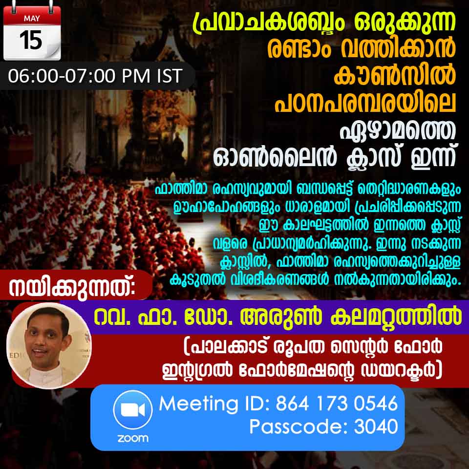 രണ്ടാം വത്തിക്കാന് കൗൺസിൽ ഓണ്ലൈന് പഠന പരമ്പരയുടെ ഏഴാമത്തെ ഓണ്ലൈന് ക്ലാസ് ഇന്നു (മെയ് 15) ശനിയാഴ്ച നടക്കും. കത്തോലിക്ക സഭയിലെ ദൈവശാസ്ത്രജ്ഞനും പാലക്കാട് രൂപതയുടെ സെന്റർ ഫോർ ഇന്റഗ്രൽ ഫോർമേഷന്റെ ഡയറക്ടറുമായ റവ. ഫാ. ഡോ. അരുൺ കലമറ്റത്തിലാണ് 'പ്രവാചകശബ്ദം' ആരംഭിച്ച പഠനപരമ്പര നയിക്കുന്നത്. ഫാത്തിമ രഹസ്യവുമായി ബന്ധപ്പെട്ട് തെറ്റിദ്ധാരണകളും ഊഹാപോഹങ്ങളും ധാരാളമായി പ്രചരിപ്പിക്കപ്പെടുന്ന ഇക്കാലഘട്ടത്തിൽ ഏറെ പ്രാധാന്യമര്ഹിക്കുന്ന ക്ലാസാണ് ഇന്നു ശനിയാഴ്ച പങ്കുവെയ്ക്കപ്പെടുന്നത്. ഇന്ത്യന് സമയം ഇന്നു വൈകീട്ട് 6 മണി മുതല് 7 മണി വരെ സൂം പ്ലാറ്റ്ഫോമിലൂടെയാണ് ക്ലാസ് നടക്കുക. ലോകത്തിന്റെ വിവിധ ഭാഗങ്ങളില് നിന്ന് വൈദികരും സമര്പ്പിതരും അല്മായരും അടക്കം മുന്നൂറിലധികം പേരാണ് ക്ലാസില് സജീവമായി പങ്കെടുക്കുന്നത്. ക്ലാസിന് ഒരുക്കമായി ഇന്ത്യന് സമയം വൈകീട്ട് 5.30നു ജപമാല ആരംഭിക്കും.