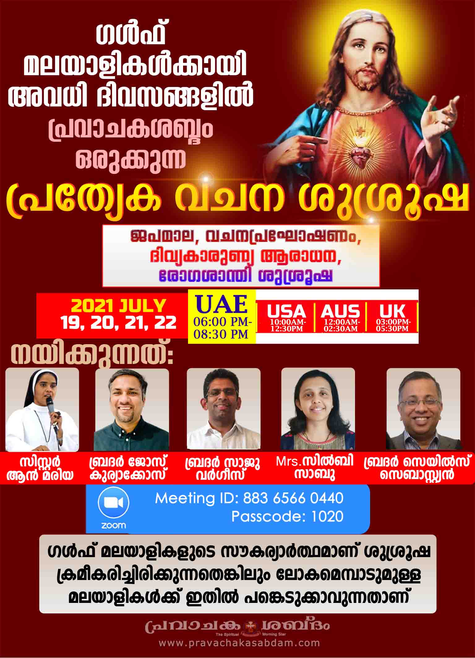 ബക്രീദിനോട് അനുബന്ധിച്ച് വരുന്ന അവധി ദിനങ്ങളില് ഗള്ഫിലെ പ്രവാസി മലയാളികള്ക്കായി പ്രത്യേക വചനശുശ്രൂഷയുമായി പ്രവാചകശബ്ദം. ജൂലൈ 19,20, 21, 22 ( തിങ്കള്, ചൊവ്വ, ബുധന്, വ്യാഴം) ദിവസങ്ങളില് ദുബായ് സമയം വൈകീട്ട് 6 മണി മുതല് 8:30 വരെയാണ് ശുശ്രൂഷ ക്രമീകരിച്ചിരിക്കുന്നത്. ജപമാല, വചനപ്രഘോഷണം, ദിവ്യകാരുണ്യ ആരാധന, രോഗശാന്തി ശുശ്രൂഷ തുടങ്ങിയവ ഉള്പ്പെടുന്ന അനുഗ്രഹീതമായ രണ്ടര മണിക്കൂര് ശുശ്രൂഷയാണ് സൂമിലൂടെ ഒരുക്കുന്നത്. പ്രമുഖ വചനപ്രഘോഷകരായ സിസ്റ്റര് ആന് മരിയ എസ്എച്ച്, ബ്രദര് ജോസ് കുര്യാക്കോസ്, ബ്രദര് സാജു വര്ഗീസ്, ബ്രദര് സെയില്സ് സെബാസ്റ്റ്യന്, Mrs. സില്ബി സാബു തുടങ്ങിയവരാണ് വിവിധ ദിവസങ്ങളിലെ ശുശ്രൂഷകള്ക്ക് നേതൃത്വം നല്കുക.