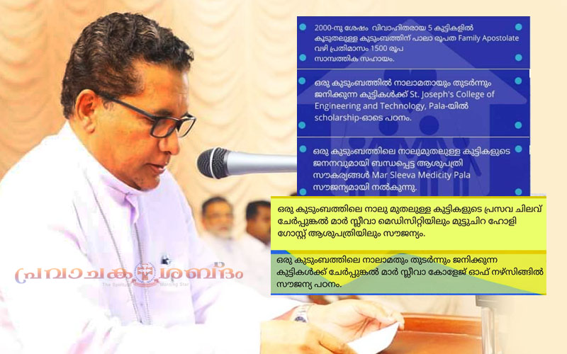 കുടുംബങ്ങൾ ഇന്ന് വലിയ സാമ്പത്തിക പ്രതിസന്ധികൾ നേരിടുന്ന കാലമാണ്. കുട്ടികളുടെ വിദ്യാഭ്യാസം, ആരോഗ്യം, ജോലി ഇവയെല്ലാം ഇന്ന് വളരെ ക്ലേശകരമായ ദൗത്യങ്ങളാണ്. കൂടുതൽ കുഞ്ഞുങ്ങൾ ഉള്ള കുടുംബ ങ്ങൾക്ക് ഇപ്പോൾ നേരിട്ടുകൊണ്ടിരിക്കുന്ന പ്രതിസന്ധികൾക്ക് ഒരു ആശ്വാസം എന്ന നിലയിലും കുടുംബ വർഷക്ഷേമ പദ്ധതികൾ എന്ന നിലയിലും ഏതാനും കർമ്മപദ്ധതികൾ പാലാ രൂപതയിൽ നടപ്പിലാക്കുന്ന കാര്യം സന്തോഷപൂർവ്വം അറിയിക്കുന്നുവെന്ന് കുറിച്ച ബിഷപ്പ് ആനുകൂല്യങ്ങൾ അക്കമിട്ട് രേഖപ്പെടുത്തിയിട്ടുണ്ട്.