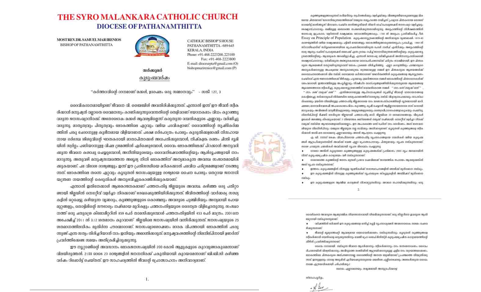 നേരത്തെ ജീവന്റെ മഹത്വത്തെ പ്രഘോഷിച്ച് പാലാ രൂപതാദ്ധ്യക്ഷന് മാര് ജോസഫ് കല്ലറങ്ങാട്ടും സമാനമായ വിധത്തില് വിവിധങ്ങളായ കുടുംബ ക്ഷേമപദ്ധതികള് പ്രഖ്യാപിച്ചിരിന്നു. ദൃശ്യമാധ്യമങ്ങള് ഇതിനെ മോശമായി ചിത്രീകരിക്കുവാന് ശ്രമിച്ചെങ്കിലും നടപടിയെ സ്വാഗതം ചെയ്തുക്കൊണ്ടാണ് വിശ്വാസികള് രംഗത്തു വന്നത്. പദ്ധതി കൂടുതല് രൂപതകളിലേക്ക് വ്യാപിപ്പിക്കണമെന്ന ആവശ്യവും വിശ്വാസികള് സോഷ്യല് മീഡിയയില് ഉന്നയിച്ചിരിന്നു. ഇതിനിടെയാണ് ശക്തമായ സര്ക്കുലറുമായി പത്തനംതിട്ട സീറോ മലങ്കര കത്തോലിക്ക രൂപതാധ്യക്ഷന് ഡോ. സാമുവേല് ഐറേനിയോസ് പിതാവും രംഗത്തുവന്നിരിക്കുന്നത്.