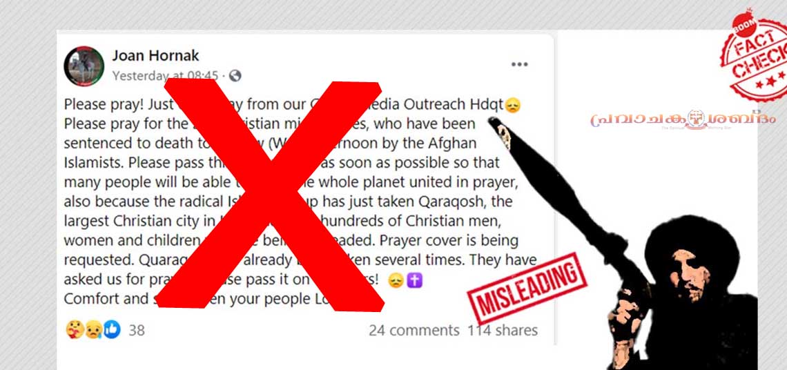 കാലിഫോര്ണിയ: ഇസ്ലാമിക തീവ്രവാദി സംഘടനയായ താലിബാന് അഫ്ഗാനിസ്ഥാന് പിടിച്ചടക്കിയതിനു പിറകേ 229 ക്രിസ്ത്യന് മിഷ്ണറിമാരെ കൂട്ടക്കൊല ചെയ്യുവാന് ഒരുങ്ങുന്നു എന്നതരത്തില് പ്രചരിക്കുന്ന സന്ദേശം വ്യാജം. വാട്സാപ്പ്, ഫേസ്ബുക്ക് അടക്കമുള്ള സമൂഹ മാധ്യമങ്ങളിലൂടെയാണ് “അഫ്ഗാനിസ്ഥാനിലെ ഇസ്ലാമിക തീവ്രവാദികള് നാളെ ഉച്ചകഴിഞ്ഞ് കൊല്ലുവാന് തീരുമാനിച്ചിട്ടുള്ള 229 ക്രിസ്ത്യന് മിഷണറിമാര്ക്ക് വേണ്ടി പ്രാര്ത്ഥിക്കൂ” എന്ന ഉള്ളടക്കമുള്ള സന്ദേശം പ്രചരിക്കുന്നത്. കഴിയുന്നവര്ക്കെല്ലാം ഇത് ഷെയര് ചെയ്യാനും പോസ്റ്റില് പറയുന്നുണ്ട്. ചില ഫേസ്ബുക്ക് പേജുകളില് ആയിരക്കണക്കിന് ആളുകളാണ് ഇത് ഷെയര് ചെയ്തിരിക്കുന്നത്. മലയാള പരിഭാഷയോട് കൂടി മിക്ക വാട്സാപ്പ് ഗ്രൂപ്പുകളിലും ഈ സന്ദേശം പ്രചരിക്കപ്പെടുന്നുണ്ട്. എന്നാല് ഇത് വ്യാജമാണ്.