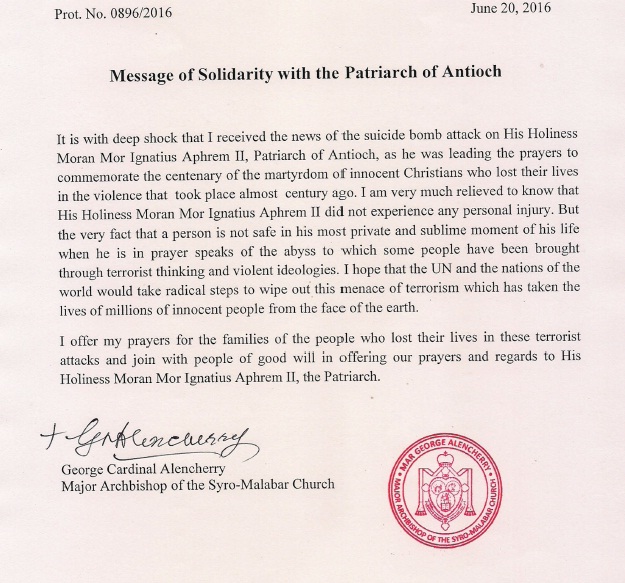 പാത്രിയര്ക്കീസ് ബാവ സുരക്ഷിതനാണെന്നറിയുന്നതില് സന്തോഷമുണ്ട്. 1915 ല് ഖാമിഷ്ലി ഖാതിയിലുണ്ടായ സെയ്ഫോ കൂട്ടക്കൊലയില് കൊല്ലപ്പെട്ട നിരപരാധികള്ക്കുവേണ്ടി സംഘടിപ്പിക്കപ്പെട്ട പ്രാര്ഥനാചടങ്ങില് പങ്കെടുത്തുകൊണ്ടിരിക്കുമ്പോഴാണു പാത്രിയര്ക്കീസ് ബാവയ്ക്കു നേരെ ആക്രമണം ഉണ്ടായതെന്നതു ആശങ്കയുണര്ത്തുന്നു. സംഭവത്തില് കൊല്ലപ്പെട്ടവര്ക്കും അവരുടെ കുടുംബാംഗങ്ങള്ക്കുമായി പ്രാര്ഥിക്കുന്നു. ഇഗ്നാത്തിയോസ് അപ്രേം ദ്വിതീയന് പാത്രിയര്ക്കീസ് ബാവയ്ക്കു പ്രാര്ഥനകള് നേരുന്നതായും കര്ദിനാള് മാര് ആലഞ്ചേരി കത്തില് അറിയിച്ചു.