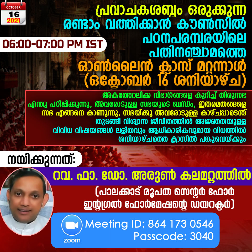 ക്രിസ്തു കേന്ദ്രീകൃത ജീവിതത്തില് ആഴപ്പെടുവാന് കത്തോലിക്ക വിശ്വാസ സത്യങ്ങള് ഏറ്റവും ലളിതവും ആധികാരികവുമായ രീതിയില് ആയിരങ്ങള്ക്ക് പകര്ന്നുക്കൊണ്ടിരിക്കുന്ന രണ്ടാം വത്തിക്കാന് കൗൺസിൽ ഓണ്ലൈന് പഠന പരമ്പരയുടെ പതിനഞ്ചാമത്തെ ഓണ്ലൈന് ക്ലാസ് മറ്റന്നാള് (ഒക്ടോബര് 16 ശനിയാഴ്ച ) നടക്കും. ശനിയാഴ്ച ഇന്ത്യന് സമയം വൈകീട്ട് 6 മണി മുതല് 7 മണി വരെ സൂം പ്ലാറ്റ്ഫോമിലൂടെയാണ് ക്ലാസ് നടക്കുക. 'പ്രവാചകശബ്ദം' ഒരുക്കുന്ന പഠനപരമ്പര കത്തോലിക്ക സഭയിലെ ദൈവശാസ്ത്രജ്ഞനും പാലക്കാട് രൂപതയുടെ സെന്റർ ഫോർ ഇന്റഗ്രൽ ഫോർമേഷന്റെ ഡയറക്ടറുമായ റവ. ഫാ. ഡോ. അരുൺ കലമറ്റത്തിലാണ് പതിവുപോലെ നയിക്കുന്നത്.