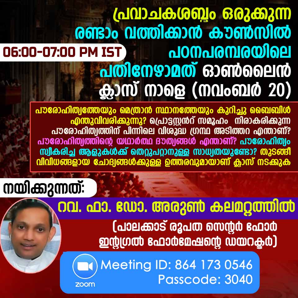 നൂറുകണക്കിന് വിശ്വാസികള് തത്സമയം പങ്കെടുത്തുക്കൊണ്ടിരിക്കുന്ന രണ്ടാം വത്തിക്കാന് കൗൺസിൽ ഓണ്ലൈന് പഠന പരമ്പരയുടെ പതിനേഴാമത് ഓണ്ലൈന് ക്ലാസ് നാളെ (നവംബര് 20) ശനിയാഴ്ച നടക്കും. പൗരോഹിത്യത്തേയും മെത്രാന് സ്ഥാനത്തേയും കുറിച്ചു ബൈബിള് എന്തുവിവരിക്കുന്നു? പ്രൊട്ടസ്റ്റന്റ് സമൂഹം നിരാകരിക്കുന്ന പൗരോഹിത്യത്തിന് പിന്നിലെ വിശുദ്ധ ഗ്രന്ഥ അടിത്തറ എന്താണ്? പൗരോഹിത്യത്തിന്റെ യഥാര്ത്ഥ ദൌത്യങ്ങള് എന്താണ്? പൗരോഹിത്യം സ്വീകരിച്ച ആളുകള്ക്ക് തെറ്റുപറ്റാനുള്ള സാധ്യതയുണ്ടോ? തുടങ്ങീ വിവിധങ്ങളായ ചോദ്യങ്ങള്ക്കുള്ള ഉത്തരവുമായാണ് നാളത്തെ ക്ലാസ് നടക്കുക.