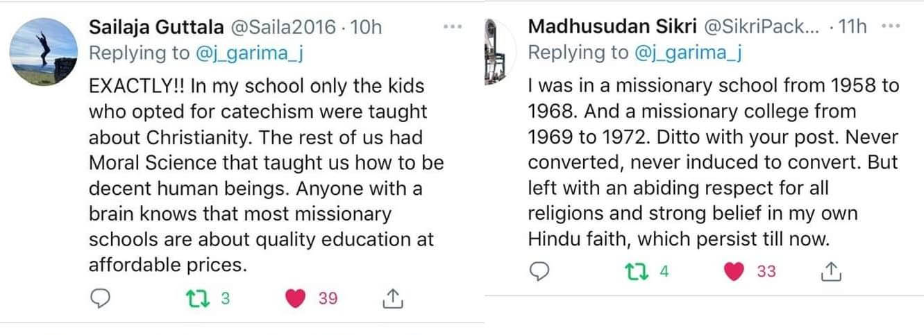 ഗരിമ പറഞ്ഞത് വളരെ ശരിയാണെന്നും തന്റെ സ്കൂളിൽ ക്രിസ്തീയ മതബോധനം തിരഞ്ഞെടുത്ത കുട്ടികള് മാത്രമേ ക്രിസ്തുമതത്തെക്കുറിച്ച് പഠിച്ചിരുന്നുള്ളൂവെന്നും അല്ലാത്തവര്ക്ക് യഥാര്ത്ഥ മനുഷ്യരായി ജീവിക്കുവാന് സന്മാര്ഗ്ഗ ക്ലാസുണ്ടായിരിന്നുവെന്നും മിക്ക മിഷനറി സ്കൂളുകളും താങ്ങാനാവുന്ന വിലയിൽ ഗുണനിലവാരമുള്ള വിദ്യാഭ്യാസമാണ് നല്കുന്നതെന്ന് തലച്ചോര് ഉള്ളവര്ക്ക് അത് മനസിലാകുമെന്നും സൈലജ ഗുട്ടാല എന്ന വ്യക്തി കമന്റ് ചെയ്തു. മധ്യപ്രദേശിലെ സാഗര് രൂപത പരിധിയില്പ്പെടുന്ന സെന്റ് ജോസഫ് സ്കൂളില് നിര്ബന്ധിത മതപരിവര്ത്തനം ആരോപിച്ച് തീവ്രഹിന്ദുത്വവാദികള് ആക്രമണം നടത്തിയതിന് പിന്നാലെയാണ് ട്വിറ്ററില് മറുപടിയുമായി അനേകര് രംഗത്തെത്തുന്നത്. സംഘപരിവാര് കാലകാലങ്ങളായി ക്രൈസ്തവര്ക്ക് നേരെ പ്രയോഗിക്കുന്ന 'നിര്ബന്ധിത മതപരിവര്ത്തനം' എന്ന വിദ്വേഷപ്രചരണത്തിനു കനത്ത താക്കീതായി ഈ ട്വീറ്റുകള് മാറുമെന്നാണ് നിരീക്ഷിക്കപ്പെടുന്നത്.