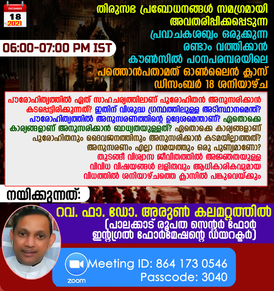 വത്തിക്കാന് കൗണ്സില് പഠനപരമ്പരയുടെ പത്തൊന്പതാമത് ഓണ്ലൈന് ക്ലാസ് ഡിസംബര് 18 ശനിയാഴ്ച