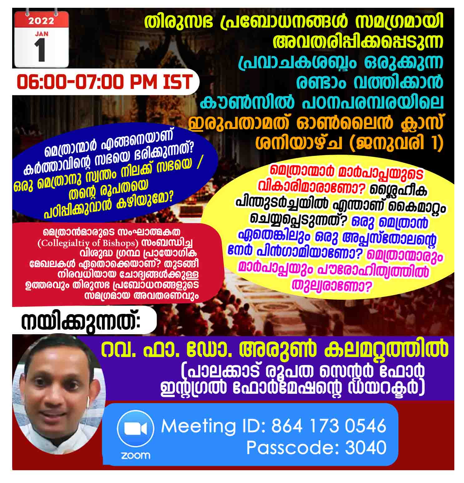 രണ്ടാം വത്തിക്കാന് കൗൺസിൽ പഠനപരമ്പരയുടെ ഇരുപതാമത് ഓണ്ലൈന് ക്ലാസ് ശനിയാഴ്ച (ജനുവരി 1)