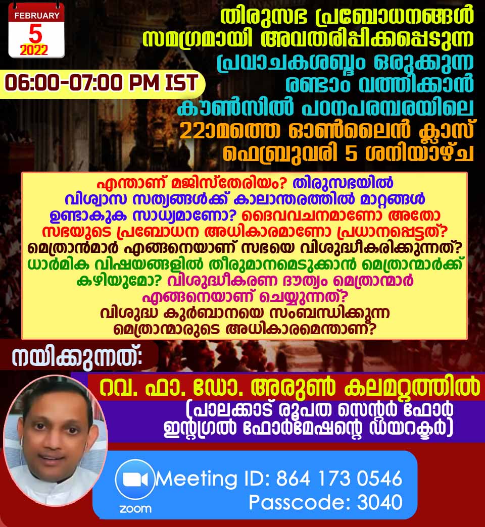 അനേകം സംശയങ്ങള്ക്കുള്ള ഉത്തരവുമായി വത്തിക്കാന് കൗൺസിൽ പഠനപരമ്പരയുടെ 22ാമത്തെ ഓണ്ലൈന് ക്ലാസ് ശനിയാഴ്ച