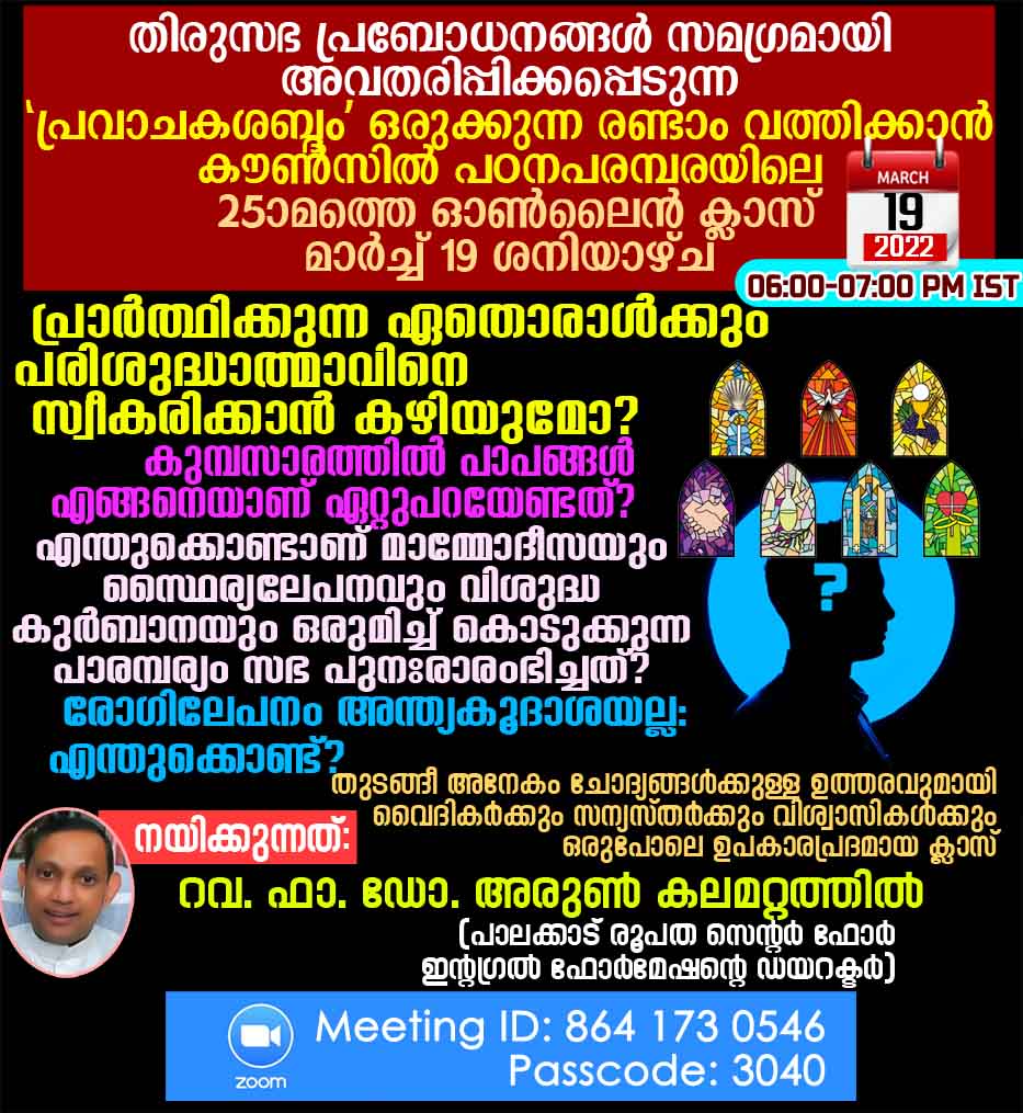 ക്ലാസിന് ഒരുക്കമായി ഇന്ത്യന് സമയം വൈകീട്ട് 5.30നു ജപമാല ആരംഭിക്കും. തിരുസഭയെ കുറിച്ചു വ്യക്തവും ലളിതവുമായ ആഴത്തിലുള്ള പഠനവും സംശയങ്ങള്ക്കുള്ള ചോദ്യോത്തര വേളയും സെഷനില് ക്രമീകരിച്ചിട്ടുണ്ട്. വൈദികര്ക്കും സന്യസ്തര്ക്കും മതാധ്യപകര്ക്കും യുവജനങ്ങള്ക്കും ഓരോ അല്മായ വിശ്വാസികള്ക്കും ഒരുപോലെ ഉപകാരപ്രദമായ ഈ ക്ലാസിലേക്ക് ഏവരെയും യേശു നാമത്തില് സ്വാഗതം ചെയ്യുന്നു.