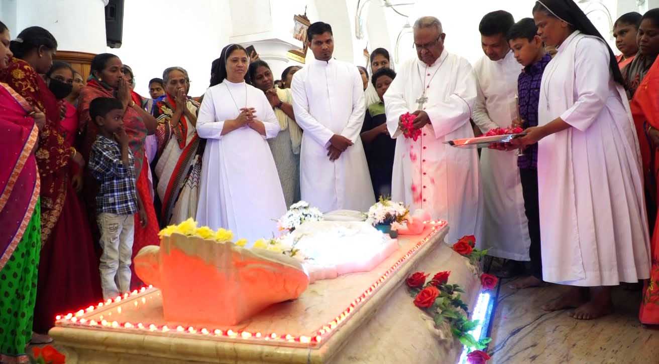 കാറ്റാടിമല വ്യാകുലമാതാ ദേവാലയത്തിൽ ഇന്നലെ തമിഴിലും മലയാളത്തിലും ദിവ്യബലിയർപ്പണം നടന്നു. വിശുദ്ധ പ്രഖ്യാപനത്തിനു തൊട്ടുപിന്നാലെ കേരളത്തിലെയും തമിഴ്നാട്ടിലെയും ലത്തീൻ സഭയുടെ കീഴിലുള്ള ദേവാലയങ്ങളിൽ പള്ളിമണികൾ മുഴങ്ങി. വിശുദ്ധ പദവി പ്രഖ്യാപനത്തിനുശേഷം കാറ്റാടിമല വ്യാകുലമാതാ ദേവാലയത്തിലെ അദ്ദേഹത്തിന്റെ തിരുസ്വരൂപത്തിൽ വ്യാകുലമാതാ ഇടവക മുൻ വികാരി ഫാ.പാട്രിക് സേവ്യർ കിരീടം ചാർത്തി. തുടർന്ന് നടന്ന കിരീട പ്രദക്ഷിണത്തിലും പരസ്യവണക്കത്തിനായി പ്രതി ഷ്ഠിക്കുന്ന ചടങ്ങിലും നൂറുകണക്കിനു വിശ്വാസികൾ പങ്കുകൊണ്ടു. നാമകരണത്തിന് പിന്നാലെ ഉച്ചകഴിഞ്ഞ് മൂന്നിന് പ്രദിക്ഷിണവും ദിവ്യബലിയും നടന്നു.