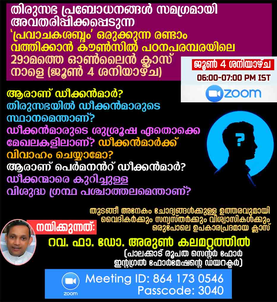 മലയാളികളായ ക്രൈസ്തവ സമൂഹത്തിന് വിശ്വാസത്തില് ആഴപ്പെടുവാന് ഏറെ സഹായകരമായ, തിരുസഭ പ്രബോധനങ്ങള് സമഗ്രമായി അവതരിപ്പിക്കുന്ന വത്തിക്കാന് കൗണ്സില് പഠനപരമ്പരയുടെ 29ാം ഓണ്ലൈന് ക്ലാസ് നാളെ ശനിയാഴ്ച (ജൂണ് 4) നടക്കും. 'പ്രവാചകശബ്ദം' ഒരുക്കുന്ന ഈ ഓണ്ലൈന് പഠനപരമ്പര പതിവുപോലെ കത്തോലിക്ക സഭയിലെ ദൈവശാസ്ത്രജ്ഞനും പാലക്കാട് രൂപതയുടെ സെന്റർ ഫോർ ഇന്റഗ്രൽ ഫോർമേഷന്റെ ഡയറക്ടറുമായ റവ. ഫാ. ഡോ. അരുൺ കലമറ്റത്തിലാണ് നയിക്കുന്നത്. നാളെ ശനിയാഴ്ച ഇന്ത്യന് സമയം വൈകീട്ട് 6 മണി മുതല് 7 മണി വരെ ZOOM പ്ലാറ്റ്ഫോമിലൂടെയാണ് ക്ലാസ് നടക്കുക.