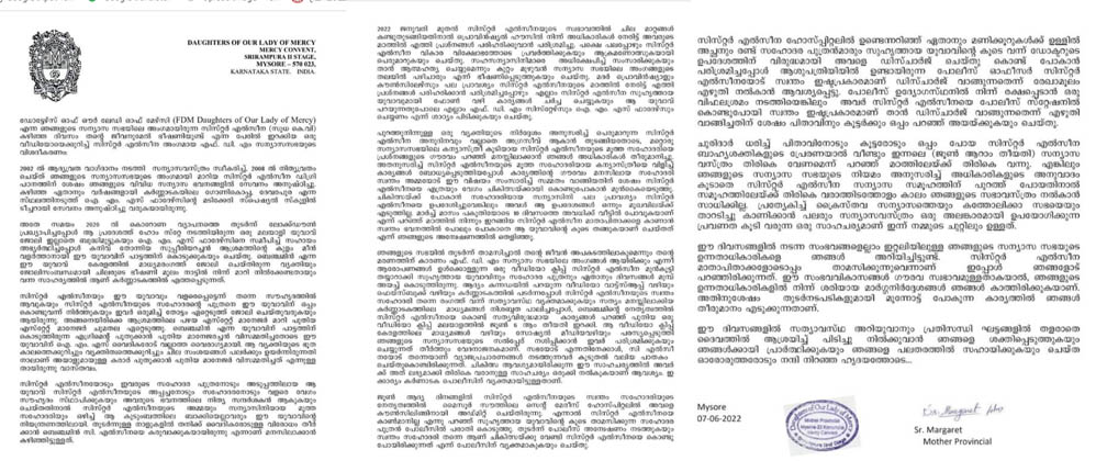 മൈസൂര്: ജീവനുമേല് ഭീഷണിയുണ്ട് എന്ന പേരില് കന്യാസ്ത്രീ കഴിഞ്ഞ ദിവസം പുറത്തുവിട്ട വീഡിയോയ്ക്കു പിന്നാലെ വ്യക്തമായ വിശദീകരണ കുറിപ്പുമായി ഡോട്ടേഴ്സ് ഓഫ് ഔര് ലേഡി ഓഫ് മേഴ്സി സന്യാസ സമൂഹം. സിസ്റ്റര് എല്സീന (സുധ കെ.വി) എന്ന സന്യാസിനിയാണ് വിവിധങ്ങളായ ആരോപണങ്ങളുമായി കഴിഞ്ഞ ദിവസം സോഷ്യല് മീഡിയയിലൂടെ രംഗത്തുവന്നത്. ഇതിന് പിന്നാലെ മാധ്യമങ്ങളിലും വ്യാപകമായ കുപ്രചരണം നടന്നിരിന്നു. .ഈ പശ്ചാത്തലത്തിലാണ് വ്യക്തമായ മറുപടിയുമായി എഫ്. ഡി. എം സുപ്പീരിയര് സിസ്റ്റര് മാര്ഗ്ഗരറ്റ് പ്രസ്താവന പുറത്തുവിട്ടിരിക്കുന്നത്.