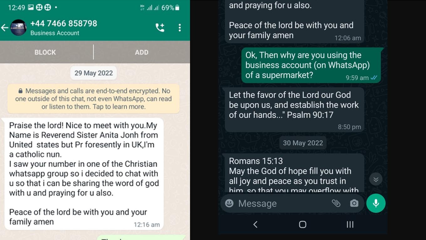 ക്രിസ്ത്യന് വാട്സപ്പ് ഗ്രൂപ്പില് നിന്നാണ് താങ്കളുടെ നമ്പര് ലഭിച്ചതെന്ന ആമുഖത്തോടെയാണ് ഇവര് ആദ്യമായി സന്ദേശം അയക്കുന്നത്. മ്യൂച്ചല് ഗ്രൂപ്പുകള് നോക്കിയാല് ഏതെങ്കിലും ക്രിസ്ത്യന് വാട്സാപ്പു ഗ്രൂപ്പുകള് ആയിരിയ്ക്കും ഉണ്ടാകുക. ഈ ഗ്രൂപ്പിലേക്ക് ഇന്വിറ്റേഷന് ലിങ്ക് വഴി പ്രവേശിച്ചവരായിരിക്കും തട്ടിപ്പുകാര്. നേരത്തെ സൂചിപ്പിച്ചപ്പോലെ വൈദികരുടെയോ സിസ്റ്റർമാരുടെയോ പ്രൊഫൈല് ചിത്രങ്ങള് ആയിരിക്കും ഉണ്ടാകുക. വിശ്വാസ്യത നേടിയെടുക്കാന് വേണ്ടിയാണ് ഗൂഗിളില് നിന്ന് ഡൌണ്ലോഡ് ചെയ്ത ചിത്രങ്ങള് ഇവര് ഉപയോഗിക്കുന്നത്.