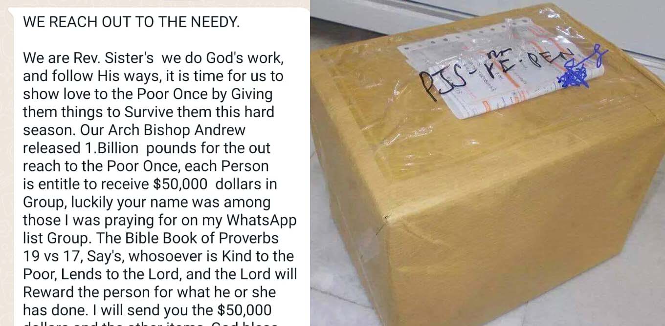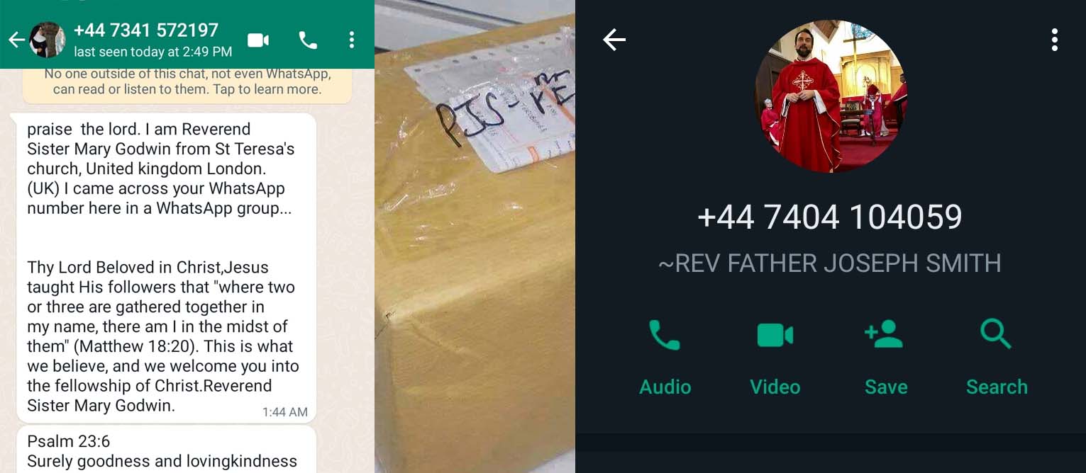 അധികംവൈകാതെ വലിയ ഒരു ബോക്സിന്റെ ചിത്രവും പാര്സല് കമ്പനിയുടെ അഡ്രസും ഉള്പ്പെടുന്ന മെസേജും അയക്കുന്നു. യാഥാര്ത്ഥ്യ ബോധത്തോടെ വിഷയത്തെ നോക്കികാണാത്തവര് കാത്തിരിപ്പ് ആരംഭിക്കുന്നു. ഒന്നോ രണ്ട് ദിവസങ്ങള്ക്കു ശേഷം കൊറിയര് ഡല്ഹിയില് എത്തിയിട്ടുണ്ടെന്നും ഇന്റര്നാഷ്ണല് കൊറിയര് ആയതിനാല് പ്രോസസിംഗ് ചാര്ജ്ജായി ഇന്ത്യയിലെ ഒരു അക്കൌണ്ടിലേക്ക് തുക അയച്ചു കൊടുക്കണമെന്നും ആവശ്യപ്പെടുന്നു. ഇതാണ് തട്ടിപ്പിന്റെ ഒരു രീതി. (വൈദികരുടെയും സിസ്റ്റര്മാരുടെയും വ്യാജ ചിത്രങ്ങള് പ്രൊഫൈല് പിക്ചറിന് ഉപയോഗിക്കുന്നതിനാല് ഇത് തട്ടിപ്പ് ആണെന്ന് പലരും മനസിലാക്കാതെപോകുന്നു).