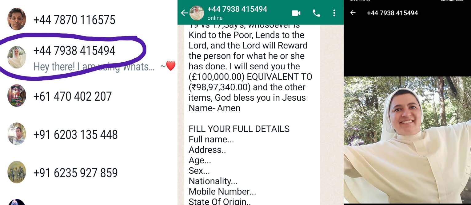 തുക ലഭിക്കുന്നതിനായി പേരും, അഡ്രസ്സും, വയസ്സും, തൊഴിലും, ഫോണ് നമ്പറും, ഇ-മെയില് ഐഡിയും ഉള്പ്പെടുന്ന വിവരങ്ങളാണ് വ്യാജ സന്ദേശത്തിന് പിന്നില് പ്രവര്ത്തിക്കുന്നവര് പിന്നീട് ആവശ്യപ്പെടുന്നത്. വാട്സാപ്പ് പേരിലുള്ളതും ഫോട്ടോയില് ഉള്ളതുമായ വ്യക്തി 'യഥാര്ത്ഥ വൈദികന്/ കന്യാസ്ത്രീ' ആണെന്ന് തെറ്റിദ്ധരിക്കുന്നവര് ഇവരെ ബന്ധപ്പെടുന്നതോടെ തട്ടിപ്പിന് ഇരയാകുകയാണ് ചെയ്യുന്നത്. ഇവരുടെ തട്ടിപ്പിന് മലയാളി ക്രൈസ്തവരായ ചിലര് ഇരകളായെന്നത് ഞെട്ടിപ്പിക്കുന്ന വസ്തുതയാണ്.