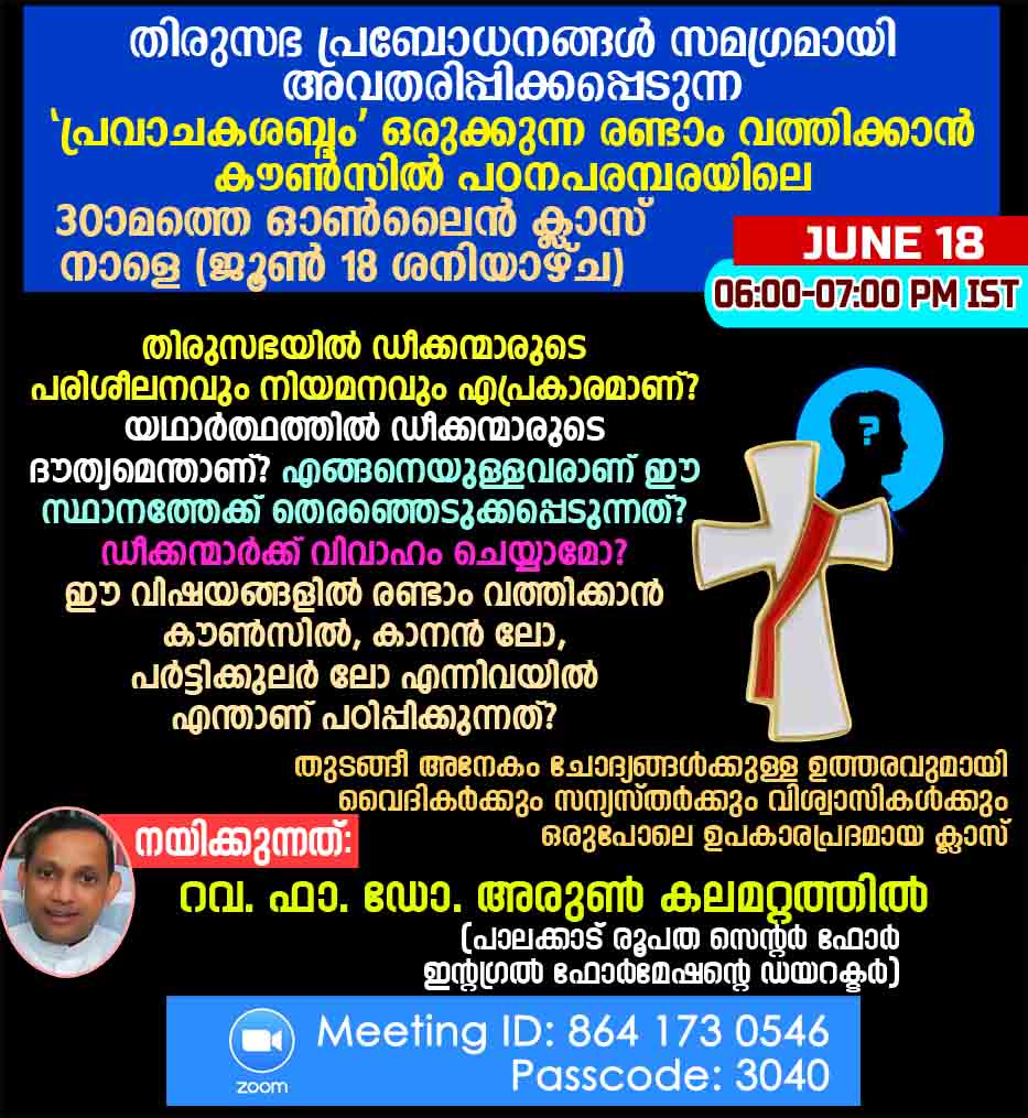 യേശുക്രിസ്തുവിലുള്ള വിശ്വാസത്തില് ആഴപ്പെടുവാന് വൈദികര്ക്കും സന്യസ്തര്ക്കും അല്മായര്ക്കും ഒരുപോലെ സഹായകരമായ രണ്ടാം വത്തിക്കാന് കൗൺസിൽ പഠനപരമ്പരയുടെ മുപ്പതാമത്തെ 'ഓണ്ലൈന്' ക്ലാസ് നാളെ ജൂൺ 18 ശനിയാഴ്ച നടക്കും. പ്രവാചകശബ്ദം ഒരുക്കുന്ന പഠനപരമ്പര കത്തോലിക്ക സഭയിലെ ദൈവശാസ്ത്രജ്ഞനും പാലക്കാട് രൂപതയുടെ സെന്റർ ഫോർ ഇന്റഗ്രൽ ഫോർമേഷന്റെ ഡയറക്ടറുമായ റവ. ഫാ. ഡോ. അരുൺ കലമറ്റത്തിലാണ് പതിവുപോലെ നയിക്കുന്നത്.