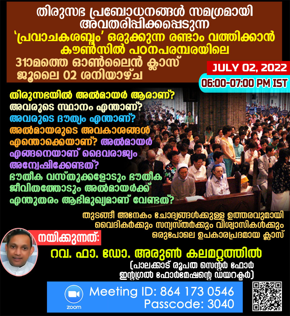 അല്മായരെ കുറിച്ച് അറിയേണ്ടതെല്ലാം: രണ്ടാം വത്തിക്കാൻ കൗൺസില് പഠനപരമ്പരയിലെ 31ാമത്തെ ഓണ്ലൈന് ക്ലാസ് ശനിയാഴ്ച (ജൂലൈ 2)