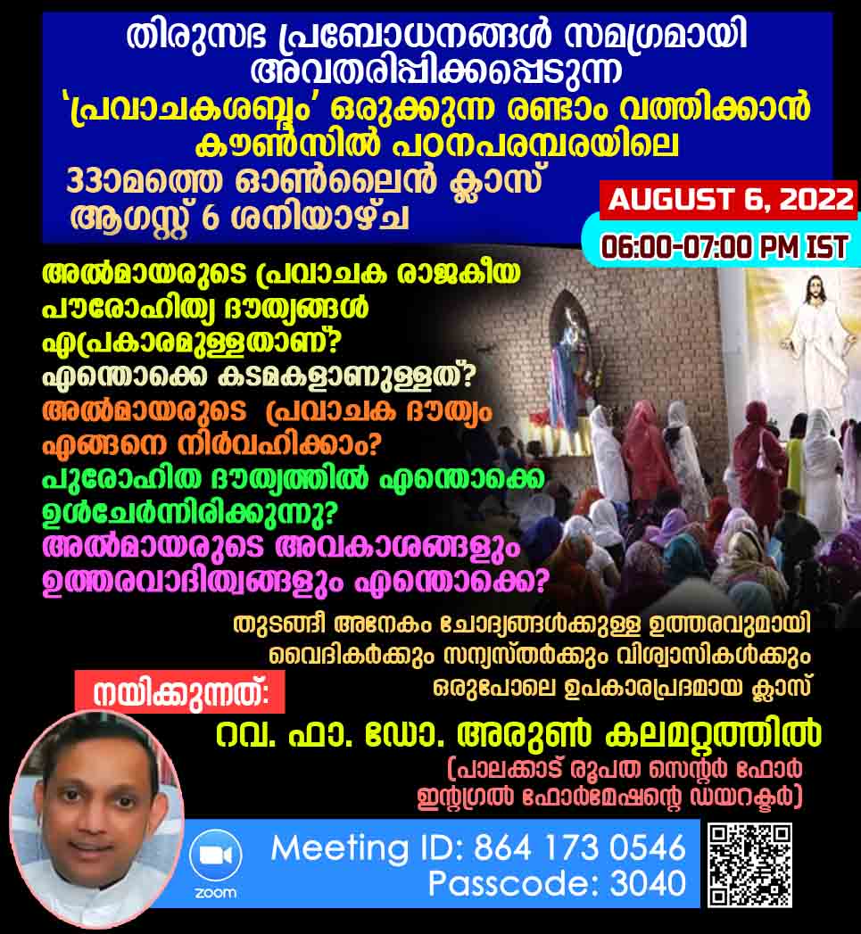 അല്മായരെ കുറിച്ചുള്ള സമഗ്ര വിവരങ്ങളുമായി 33ാമത്തെ ഓണ്ലൈന് ക്ലാസ് ശനിയാഴ്ച (ആഗസ്റ്റ് 6)