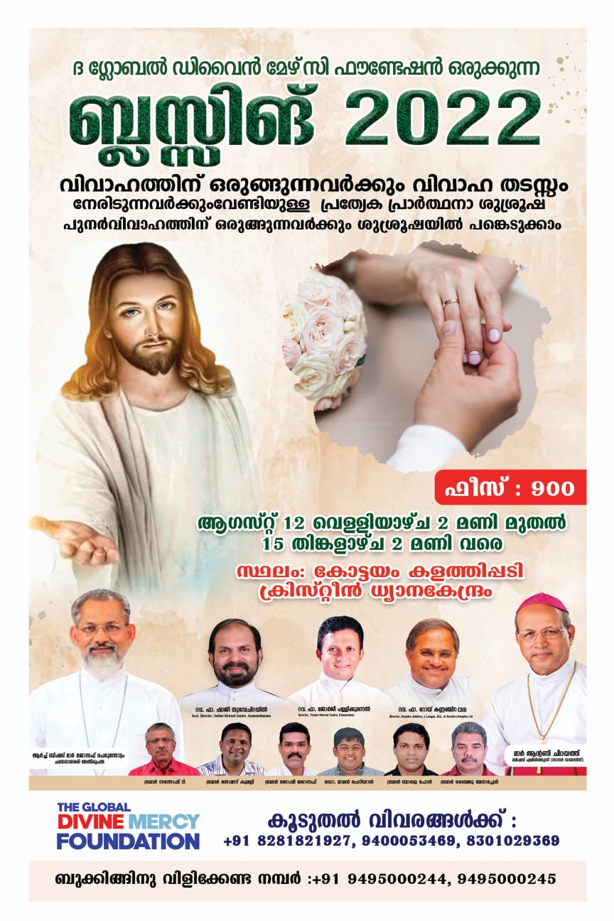 വിവാഹത്തിനായി ഒരുങ്ങുന്നവരും വിവാഹ തടസ്സം നേരിടുന്നവരുമായ സഹോദരങ്ങൾക്കായി കോട്ടയം കളത്തിപ്പടി ക്രിസ്റ്റീൻ ധ്യാനകേന്ദ്രത്തിൽവെച്ച് പ്രത്യേക പ്രാർത്ഥനാ ശുശ്രൂഷ നടക്കുന്നു. 2022 ആഗസ്റ്റ് 12 വെള്ളിയാഴ്ച ഉച്ചകഴിഞ്ഞ് 3.00 മണിക്ക് ആരംഭിച്ച് ആഗസ്റ്റ് 15 തിങ്കളാഴ്ച ഉച്ചകഴിഞ്ഞ് 2.00 മണിക്ക് സമാപിക്കുന്ന വിധത്തിലാണ് പ്രാര്ത്ഥനാശുശ്രൂഷ. 'ബ്ലെസ്സിങ് 2022' എന്ന പേരിൽ 'ദ ഗ്ലോബൽ ഡിവൈൻ മേഴ്സി ഫൗണ്ടേഷൻ' ഒരുക്കുന്ന ഈ പ്രാർത്ഥനാ ശുശ്രൂഷ നയിക്കുന്നത് ഫാ. ഷാജി തുമ്പേച്ചിറയിലാണ്.