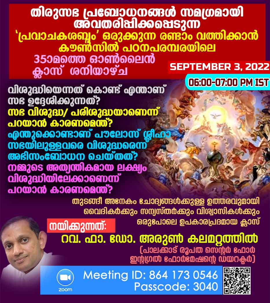 'വിശുദ്ധിയിലേക്കുള്ള സഭയുടെ സാര്വ്വത്രിക വിളി' എന്ന വിഷയത്തെ കേന്ദ്രീകരിച്ചായിരിക്കും നാളെ ക്ലാസ് നടക്കുക. വിശുദ്ധിയെന്നത് കൊണ്ട് എന്താണ് സഭ ഉദ്ദേശിക്കുന്നത്? സഭ വിശുദ്ധ/ പരിശുദ്ധയാണെന്ന് പറയാന് കാരണമെന്ത്? എന്തുക്കൊണ്ടാണ് പൗലോസ് ശ്ലീഹാ സഭയിലുള്ളവരെ വിശുദ്ധരെന്ന് അഭിസംബോധന ചെയ്തത്? നമ്മുടെ അന്ത്യന്തികമായ ലക്ഷ്യം വിശുദ്ധിയിലേക്കാണെന്ന് പറയാന് കാരണമെന്ത്? എങ്ങനെയാണ് വിശുദ്ധി പാലിക്കുക? തുടങ്ങീ വിവിധങ്ങളായ ചോദ്യങ്ങള്ക്കുള്ള ഉത്തരം നാളത്തെ ക്ലാസില് പങ്കുവെയ്ക്കപ്പെടും.