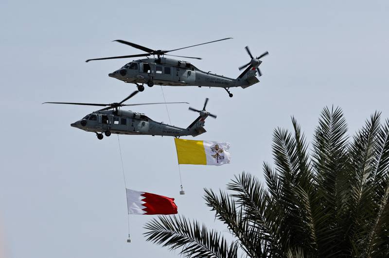 വേദിയില് നിന്ന് 200 മതാന്തര നേതാക്കളെയും സർക്കാർ ഉദ്യോഗസ്ഥരെയും അഭിസംബോധന ചെയ്തു പാപ്പ സംസാരിച്ചു. സമീപ വർഷങ്ങളിൽ മിഡിൽ ഈസ്റ്റിനെ ബാധിച്ച തീവ്രവാദത്തെ നേരിടാൻ സംഭാഷണത്തിന്റെ ആവശ്യകതയാണ് പരിപാടിയില് പ്രഭാഷണം നടത്തിയവര് പ്രധാനമായും ചൂണ്ടിക്കാട്ടിയത്. റോയൽ ബഹ്റൈൻ എയർഫോഴ്സ് വത്തിക്കാൻ സിറ്റിയുടെയും ബഹ്റൈന്റെയും പതാകകൾ പറത്തി നടത്തിയ വ്യോമ പ്രകടനത്തിന്റെ ചിത്രങ്ങളും ഇതോടൊപ്പം കാണാം.