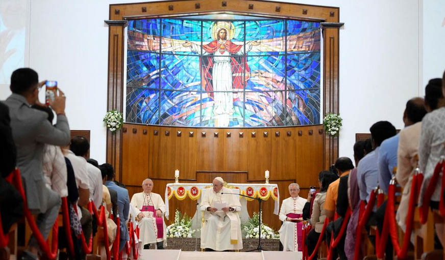 ദേവാലയത്തിൻറെ പ്രവേശനകവാടത്തിനരികെവച്ച് പാപ്പായ്ക്ക് ചുംബിക്കാൻ ക്രൂശിതരൂപവും തളിക്കാൻ വിശുദ്ധ ജലവും നല്കി. തുടർന്ന് പാപ്പാ അവരുമൊത്ത് ദേവാലയത്തിൻറെ മദ്ധ്യത്തിലൂടെ അൾത്താരയുടെ അടുത്തേക്ക് സാവധാനം നീങ്ങി. ഇരുവശത്തും ഉണ്ടായിരുന്നവരെ പാപ്പ ചക്രക്കസേരയിൽ ഇരുന്നുകൊണ്ട് അഭിവാദ്യം ചെയ്തു. വേദിയിലെത്തിയ പാപ്പ, ആമുഖ പ്രാർത്ഥന ചൊല്ലിയതിനെ തുടർന്ന് ബിഷപ്പ് പോൾ ഹിന്ഡര് ഔദ്യോഗികമായി പാപ്പയെ സ്വാഗതം ചെയ്തു. അവിടെ പാപ്പ സന്ദേശം നല്കി. മെത്രാന്മാരും വൈദികരും സമർപ്പിതരും അജപാലനപ്രവർത്തകരുമൊത്തുള്ള പ്രാർത്ഥനാ സമാഗമാനന്തരം പാപ്പാ 27 കിലോമീറ്റർ അകലെ അവാലിയിലുള്ള സകിർ എയർബേസ് എന്നറിയപ്പെടുന്ന ചെറു വിമാനത്താവളത്തിലേക്ക് കാറിൽ പോയി.