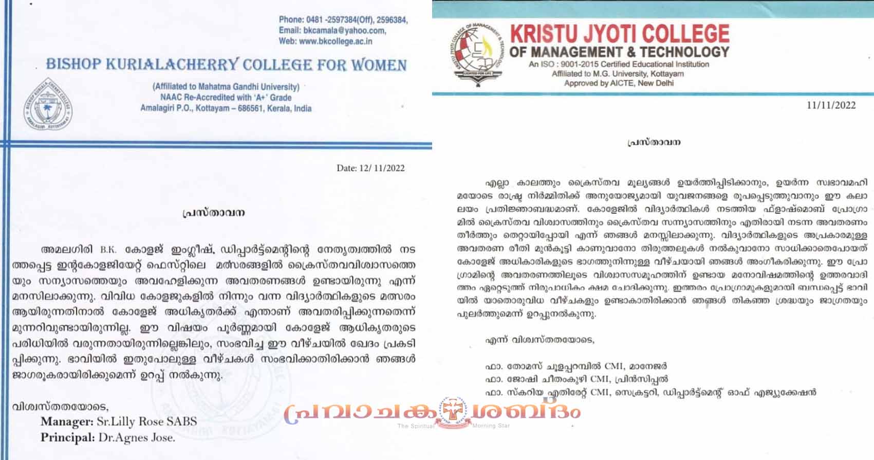 ഇന്റര് കോളജിയേറ്റ് ഫെസ്റ്റിലെ മത്സരങ്ങളിൽ ക്രൈസ്തവ വിശ്വാസത്തെയും സന്യാസത്തെയും അവഹേളിക്കുന്ന അവതരണങ്ങൾ ഉണ്ടായിരുന്നുവെന്നു മനസിലാക്കുന്നുവെന്നും വിവിധ കോളേജുകളില് നിന്നുള്ളവര് എന്താണ് അവതരിപ്പിക്കുന്നതെന്ന് കോളേജ് അധികൃതർക്ക് മുന്നറിവുണ്ടായിരുന്നില്ലായെന്നും എന്നാല് തെറ്റ് അംഗീകരിക്കുകയാണെന്നും 'സിസ്റ്റേഴ്സ് ഓഫ് ദ അഡോറേഷന് ഓഫ് ദ ബ്ലസ്ഡ് സാക്രമെന്റ്' നടത്തുന്ന ബികെ കോളേജ് പ്രസ്താവിച്ചു. ഭാവിയിൽ ഇതുപോലുള്ള വീഴ്ചകൾ സംഭവിക്കാതിരിക്കാൻ ജാഗരൂകരായിരിക്കുമെന്ന് ഉറപ്പ് നൽകുന്നതായും മാനേജര് സിസ്റ്റര് ലില്ലി റോസ് എസ്എബിഎസ്, പ്രിന്സിപ്പാള് ഡോ. ആഗ്നസ് ജോസ് അറിയിച്ചു.