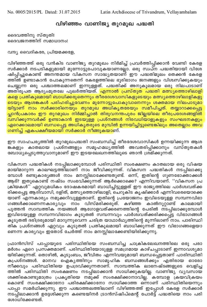 സര്ക്കുലറിന്റെ ആദ്യ ഖണ്ഡികയുടെ ആദ്യഭാഗത്ത് പറയുന്നതു ഇങ്ങനെ -''വിഴിഞ്ഞത്ത് ഒരു വൻകിട വാണിജ്യ തുറമുഖം നിർമിച്ച് പ്രവർത്തിപ്പിക്കാൻ വേണ്ടി കേരള സർക്കാർ നടപടികളുമായി മുന്നോട്ടുപോവുകയാണല്ലോ. ഒരു സ്വപ്ന പദ്ധതിയായി വിശേ ഷിപ്പിച്ചുകൊണ്ട് അനന്തമായ വികസന സാദ്ധ്യതയാണ് ഈ പദ്ധതിമൂലം തെക്കൻ കേരള ത്തിൽ ഉണ്ടാക്കാൻ പോകുന്നതെന്ന് കേരളത്തിലെ ഭൂരിഭാഗം ജനങ്ങളും വിശ്വസിക്കുകയും ചെയ്യുന്ന ഒരു പശ്ചാത്തലമാണ് ഇന്നുള്ളത്. പദ്ധതിക്ക് അനുകൂലമായ ഒരു നിലപാടാണ് അതിരൂപത ആദ്യം മുതലേ പുലർത്തിയത്''.