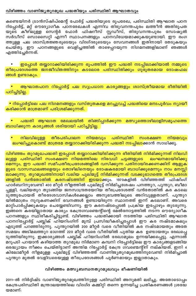 സര്ക്കുലറിന്റെ മുന്നോട്ടുള്ള ഭാഗങ്ങളിലും വിഷയം വ്യക്തമായി അവതരിപ്പിക്കുന്നുണ്ട്. ''ഇപ്പോൾ തയ്യാറാക്കിയിരിക്കുന്ന രൂപത്തിൽ ഈ പദ്ധതി നടപ്പിലാക്കിയാൽ നമ്മുടെ തീരപ്രദേശത്തെ ജനജീവിതത്തിനും കടലോര പരിസ്ഥിതിക്കും ഗുരുതരമായ ദോഷഫലങ്ങൾ ഉണ്ടാകും. ആഘാതപഠന റിപ്പോർട്ട് പല സുപ്രധാന കാര്യങ്ങളും ശാസ്ത്രീയമായ രീതിയിൽ പഠിച്ചിട്ടില്ല, റിപ്പോർട്ടിലെ പല നിഗമനങ്ങളും വസ്തുതകളെ മറച്ചുവച്ച് പദ്ധതിയെ മനഃപൂർവം ന്യായീകരിക്കാൻ മാത്രമാണ് പരിശ്രമിക്കുന്നത്, പദ്ധതി ആഘാത മേഖലയിൽ തിങ്ങിപ്പാർക്കുന്ന മത്സ്യത്തൊഴിലാളിസമൂഹത്തെ ബാധിക്കുന്ന കാര്യങ്ങൾ ശരിയായി പഠിച്ചിട്ടില്ല, നിലവിലുള്ള തീരപരിപാലന നിയമവും പരിസ്ഥിതി സംരക്ഷണ നിയമവും ലംഘിച്ചുകൊണ്ട് മാത്രമേ തയ്യാറാക്കിയിരിക്കുന്ന പദ്ധതി നടപ്പിലാക്കാൻ സാധിക്കൂ". തുടങ്ങീ നിരവധി വസ്തുതകള് ഏഴു വര്ഷങ്ങള്ക്ക് മുന്പ് പുറപ്പെടുവിച്ച സര്ക്കുലറില് ചൂണ്ടിക്കാട്ടുന്നു.