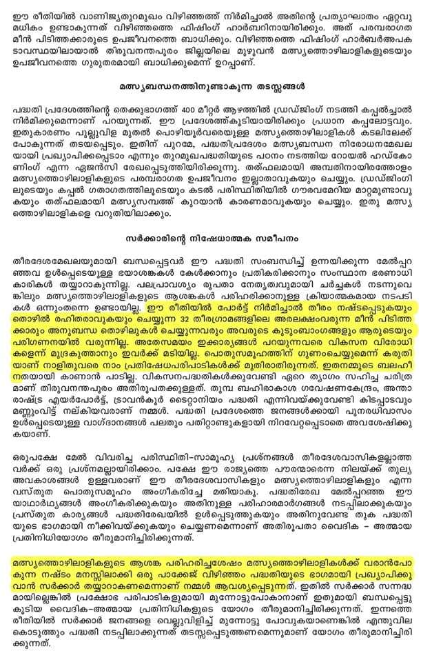 ആദ്യ ഖണ്ഡികയില് തന്നെ രണ്ടാം ഭാഗത്ത് പറയുന്നതു ഇങ്ങനെ- '' എന്നാല് പദ്ധതി മത്സ്യത്തൊഴിലാളികളെ പ്രതികൂലമായി ബാധിക്കരുതെന്നും തീരദേശവാസികളുടെയും മത്സ്യത്തൊഴിലാളികളുടെയും ആശങ്കകൾ പരിഹരിച്ചുവേണം മുന്നോട്ടുപോകുവാനെന്നും ശക്തമായ നിലപാടുമായിട്ടാണ് നാം സർക്കാരിനെയും തുറമുഖ അധികൃതരേയും സമീപിച്ചത്. തയ്യാറാക്കപ്പെട്ട പ്ലാൻപ്രകാരം ഈ തുറമുഖം നിർമ്മിച്ചാൽ തിരുവനന്തപുരം ജില്ലയിലെ തീരപ്രദേശങ്ങളിൽ വസിക്കുന്നവർക്ക് ഉണ്ടാകാൻ ഇടയുള്ള പ്രശ്നങ്ങൾ നിരവധിയാളുകളും സംഘടനകളും ഏറെക്കാലമായി ബന്ധപ്പെട്ട അധികൃതരുടെ മുമ്പിൽ ഉന്നയിച്ചിട്ടുണ്ടെങ്കിലും അതെല്ലാം അവഗണിച്ച് ഏകപക്ഷീയമായി സർക്കാർ നീങ്ങുകയാണ്''- 2015-ലെ സര്ക്കുലറില് പറയുന്നു. തിരുവനന്തപുരം ലത്തീന് അതിരൂപത വിഴിഞ്ഞം പദ്ധതി വിഷയത്തില്, അന്നു സ്വീകരിച്ച അതേ നിലപാട് തന്നെയാണ് ഇന്നുമെന്ന് അസന്നിഗ്ധമായി പ്രഖ്യാപിക്കുന്നതാണ് സര്ക്കുലര്.