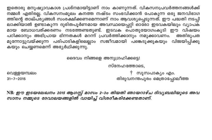 തിരുവനന്തപുരം അതിരൂപതയുടെ മുന് അധ്യക്ഷന് ആര്ച്ച് ബിഷപ്പ് സൂസപാക്യം വര്ഷങ്ങള്ക്ക് മുന്പ് വിഴിഞ്ഞം പദ്ധതിയെ അനുകൂലിച്ചുവെന്ന കുപ്രചരണത്തിനിടെ സത്യാവസ്ഥ വ്യക്തമാക്കുന്ന സര്ക്കുലര് ചര്ച്ചയാകുന്നു. 2015 ജൂലൈ 31നു അതിരൂപത കാര്യാലയത്തില് നിന്ന് പുറപ്പെടുവിച്ച ഇടയലേഖനത്തില് നയം വ്യക്തമായി ആര്ച്ച് ബിഷപ്പ് അവതരിപ്പിച്ചിട്ടുണ്ട്. വിഴിഞ്ഞം പദ്ധതിയിലൂടെ ഉണ്ടാകുന്ന വികസന സാധ്യതകളെ അനുകൂലിക്കുമ്പോഴും ഇത് മൂലം ഉണ്ടാകുന്ന പ്രത്യാഘാതങ്ങളെ കുറിച്ചുള്ള ആശങ്ക സര്ക്കുലറില് വ്യക്തമായി പങ്കുവെയ്ക്കുന്നുണ്ടെന്നതു ഏറെ ശ്രദ്ധേയമായ കാര്യമാണ്.