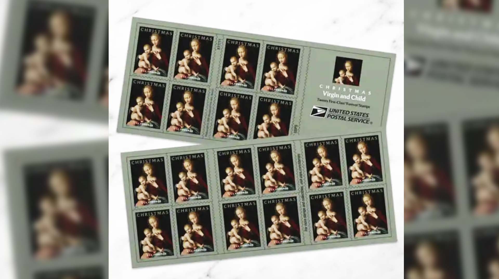 1960 മുതല് വിശ്വാസപരമായ പ്രമേയമുള്ള സ്റ്റാമ്പുകള് അമേരിക്കന് പോസ്റ്റല് ഡിപ്പാര്ട്ട്മെന്റ് പുറത്തിറക്കുന്നുണ്ട്. “വിര്ജിന് ആന്ഡ് ചൈല്ഡ്” 60 സെന്റ് വിലവരുന്ന ഒന്നാം ക്ലാസ് വിഭാഗത്തില്പെട്ട സ്റ്റാമ്പാണ്. ക്രിസ്തുമസ് കാലത്ത് ‘ഹോളിഡേ എല്വ്സ്’, ‘സ്നോവി ബ്യൂട്ടി’, ‘വിന്റര് ബ്ലൂംസ്’, ‘ഹനൂക്ക’, ‘ക്വാന്സാ’ എന്നിങ്ങനെയുള്ള അവധിക്കാല സ്റ്റാമ്പുകളും അമേരിക്കന് തപാല് വകുപ്പ് പുറത്തിറക്കുന്നുണ്ടെങ്കിലും ‘എക്കാലത്തേക്കും’ എന്ന വിഭാഗത്തിലാണ് ‘വിര്ജിന് ആന്ഡ് ചൈല്ഡ്’ ഉള്പ്പെടുന്നത്.