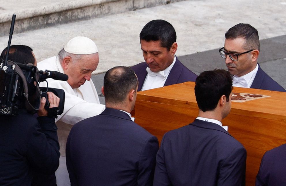 Tag: Pope Francis touches the casket of Pope Benedict XVI at the conclusion of his funeral, Pope Francis silent prayer, Pravachaka Sabdam, Catholic Malayalam News, Christian Malayalam News