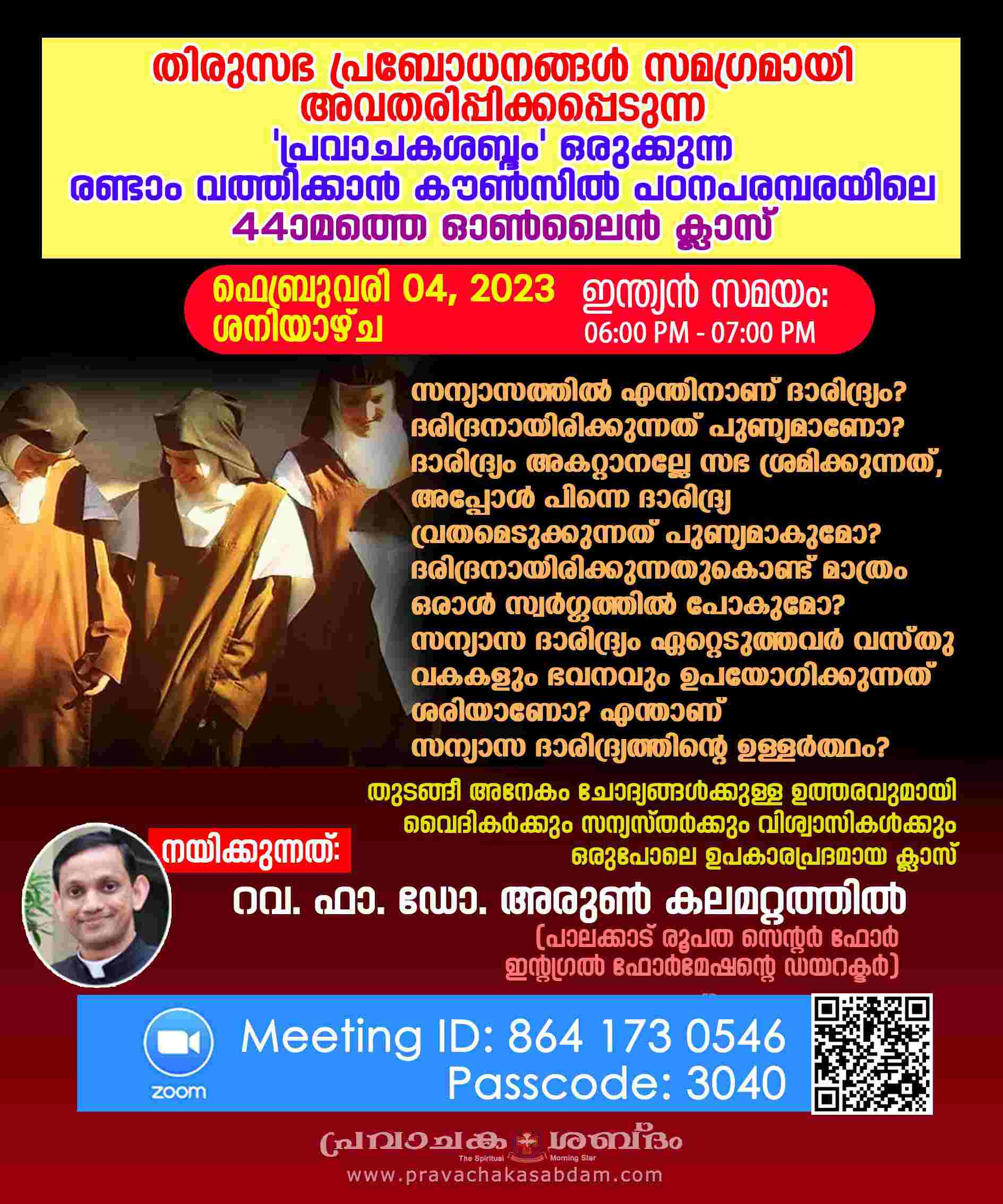 സന്യാസത്തിൽ എന്തിനാണ് ദാരിദ്ര്യം? ദരിദ്രനായിരിക്കുന്നത് പുണ്യമാണോ? ദാരിദ്ര്യം അകറ്റാനല്ലേ സഭ ശ്രമിക്കുന്നത്, അപ്പോൾ പിന്നെ ദാരിദ്ര്യ വ്രതമെടുക്കുന്നത് പുണ്യമാകുമോ? ദരിദ്രനായിരിക്കുന്നതുകൊണ്ട് മാത്രം ഒരാൾ സ്വർഗ്ഗത്തിൽ പോകുമോ? സന്യാസ ദാരിദ്ര്യം ഏറ്റെടുത്തവർ വസ്തുവകകളും ഭവനവും ഉപയോഗിക്കുന്നത് ശരിയാണോ? എന്താണ് സന്യാസ ദാരിദ്ര്യത്തിന്റെ ഉള്ളർത്ഥം? തുടങ്ങീ വിശ്വാസ ജീവിതത്തില് നാം അഭിമുഖീകരിക്കുന്ന വിവിധങ്ങളായ ചോദ്യങ്ങള്ക്കുള്ള ഉത്തരവുമായി രണ്ടാം വത്തിക്കാന് കൗൺസിൽ പഠന പരമ്പരയുടെ 44മത്തെ ക്ലാസ് നാളെ ശനിയാഴ്ച (ഫെബ്രുവരി 4, 2023) നടക്കും.