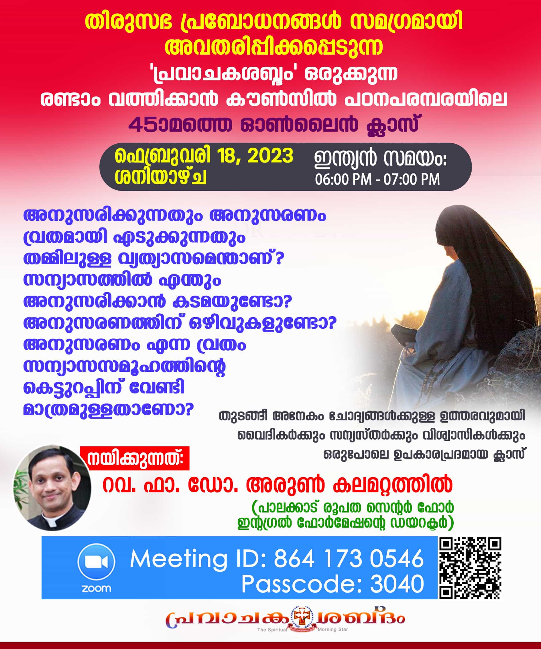 പ്രവാചകശബ്ദം ഒരുക്കുന്ന ക്ലാസ്, പാലക്കാട് രൂപതയുടെ സെന്റർ ഫോർ ഇന്റഗ്രൽ ഫോർമേഷന്റെ ഡയറക്ടറും പ്രമുഖ ദൈവശാസ്ത്രജ്ഞനുമായ റവ. ഫാ. ഡോ. അരുൺ കലമറ്റത്തിലാണ് പതിവുപോലെ നയിക്കുന്നത്. നാളെ ഇന്ത്യന് സമയം വൈകീട്ട് 6 മുതല് ഏഴു മണിവരെയാണ് ക്ലാസ്. ക്ലാസിന് ഒരുക്കമായി ഇന്ത്യന് സമയം വൈകീട്ട് 5.30നു ജപമാല ആരംഭിക്കും. ക്ലാസില് സംശയനിവാരണത്തിനും പ്രത്യേക അവസരമുണ്ട്.