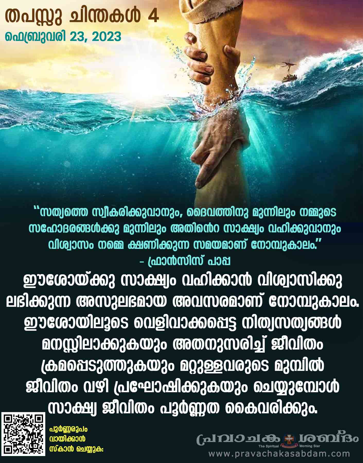 ഈശോയ്ക്കു സാക്ഷ്യം വഹിക്കാൻ വിശ്വാസിക്കു ലഭിക്കുന്ന അസുലഭമായ അവസരമാണ് നോമ്പുകാലം. ഈശോയിലൂടെ വെളിവാക്കപ്പെട്ട നിത്യസത്യങ്ങൾ മനസ്സിലാക്കുകയും അതനുസരിച്ച് ജീവിതം ക്രമപ്പെടുത്തുകയും മറ്റുള്ളവരുടെ മുമ്പിൽ ജീവിതം വഴി പ്രഘോഷിക്കുകയും ചെയ്യുമ്പോൾ സാക്ഷ്യ ജീവിതം പൂർണ്ണത കൈവരിക്കും. ദൈവവചനത്തിൽ ഇതൾ വിരിയുന്ന സ്നേഹത്തിൻ്റെയും സാഹോദര്യത്തിൻ്റെയും കാരുണ്യത്തിൻ്റെയും സന്ദേശം ജീവിത സത്ഫലങ്ങളിലൂടെ ലോകത്തിനു നൽകുക എന്നത് ക്രിസ്ത്യാനിയുടെ കടമയും ഉത്തരവാദിത്വവുമാണ്.