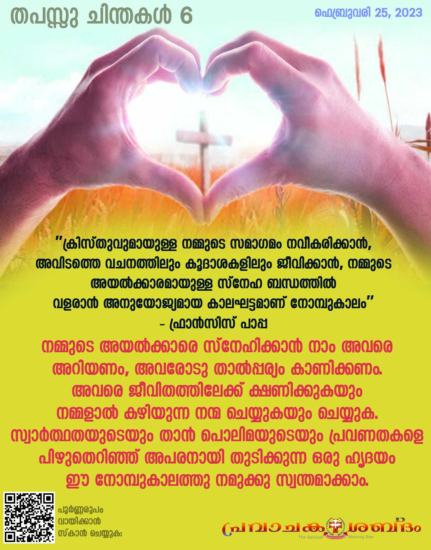 നമ്മുടെ അയൽക്കാരെ സ്നേഹിക്കാൻ നാം അവരെ അറിയണം, അവരോടു താൽപ്പര്യം കാണിക്കണം, അവരുടെ ആവശ്യങ്ങളുടെ നേരേ ആത്മാർത്ഥമായ തുറവി വളർത്തണം, അവർക്കു നന്മ ചെയ്യാനുള്ള നല്ല മനസ്സ് രൂപപ്പെടുത്തണം,അവരെ നമ്മുടെ ജീവിതത്തിലേക്ക് ക്ഷണിക്കുകയും നമ്മളാൽ കഴിയുന്ന നന്മ ചെയ്യുകയും ചെയ്യുക. സ്വാർത്ഥതയുടെയും താൻ പൊലിമയുടെയും പ്രവണതകളെ പിഴുതെറിഞ്ഞ് അപരനായി തുടിക്കുന്ന ഒരു ഹൃദയം ഈ നോമ്പുകാലത്തു നമുക്കു സ്വന്തമാക്കാം.