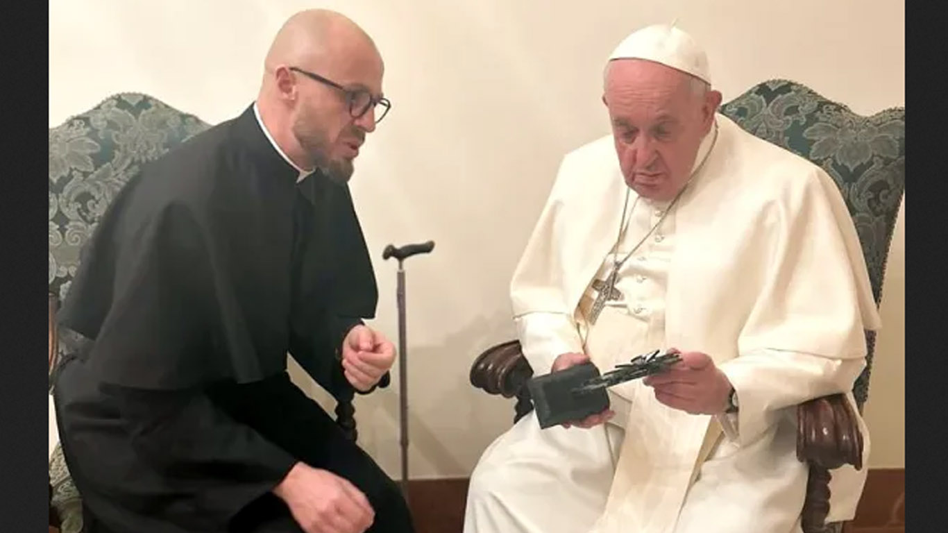 സഹനത്തിന്റെ പ്രതീകം: പാപ്പക്ക് യുദ്ധാവശിഷ്ടങ്ങള് കൊണ്ട് നിര്മ്മിച്ച കുരിശ് സമ്മാനിച്ച് യുക്രൈന് വൈദികന്