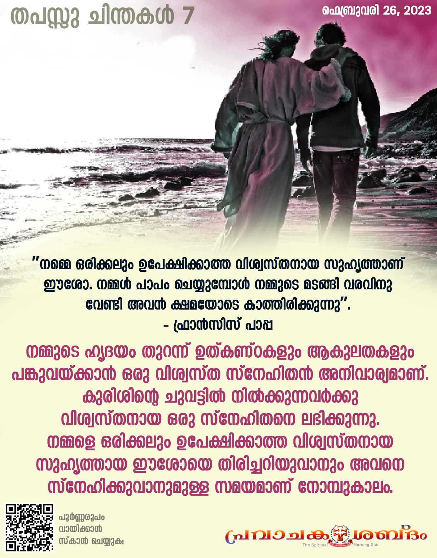നമ്മളെ ഒരിക്കലും ഉപേക്ഷിക്കാത്ത വിശ്വസ്തനായ സുഹൃത്തായ ഈശോയെ തിരിച്ചറിയുവാനും അവനെ സ്നേഹിക്കുവാനുമുള്ള സമയമാണ് നോമ്പുകാലം. "വിശ്വസ്ത സ്നേഹിതനെപ്പോലെ അമൂല്യമായി ഒന്നുമില്ല; അവന്റെ മാഹാത്മ്യം അളവറ്റതാണ്. വിശ്വസ്തനായ സ്നേഹിതന് ജീവാമൃതമാണ്" (പ്രഭാഷകന് 6 : 15-16) എന്നു പ്രഭാഷക ഗ്രന്ഥം നമ്മളെ പഠിപ്പിക്കുന്നു.