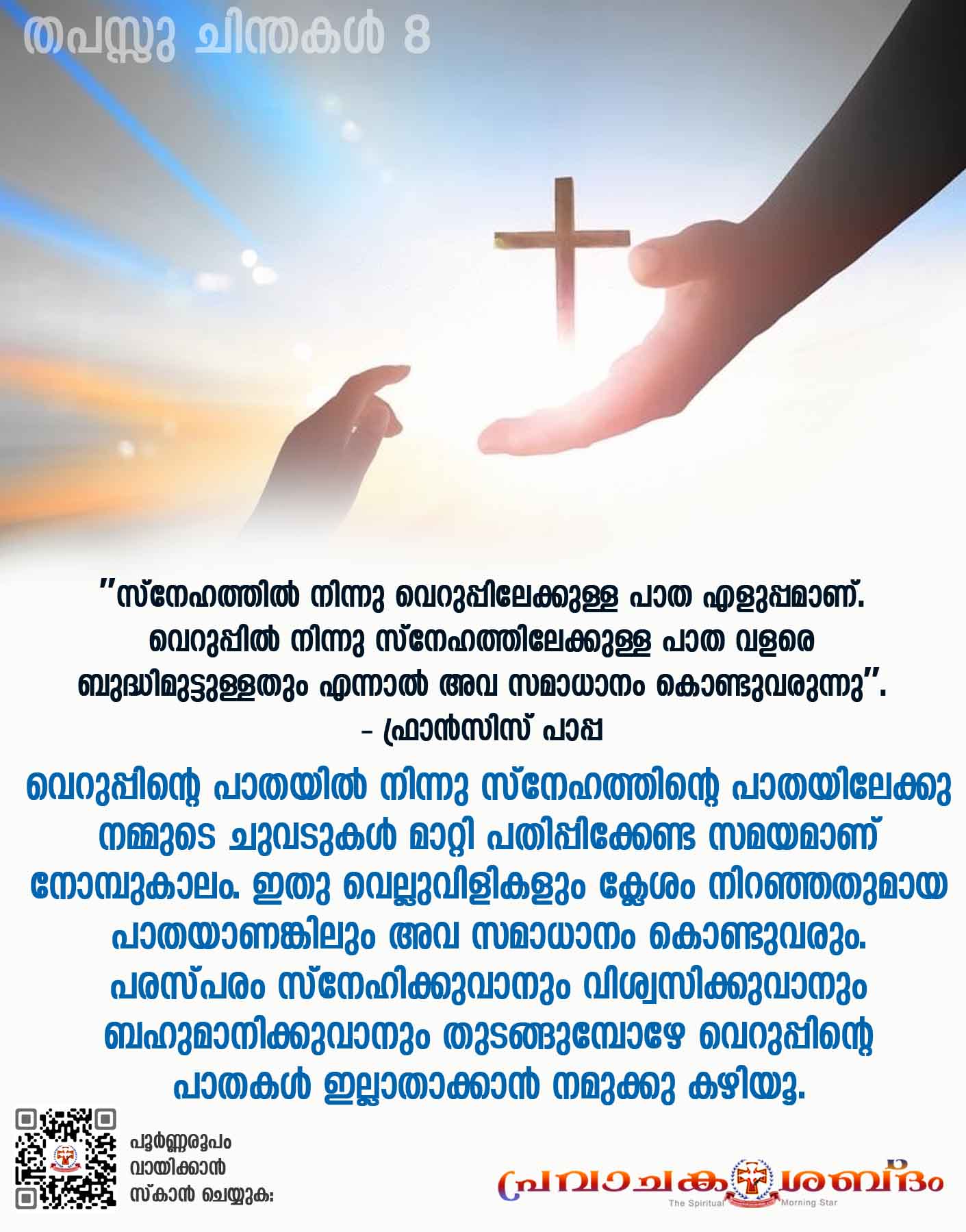 "മനസ്സില് വിദ്വേഷമുള്ളവന് വാക്കുകൊണ്ടു സ്നേഹം നടിക്കുകയും ഹൃദയത്തില് വഞ്ചന പുലര്ത്തുകയും ചെയ്യുന്നു" (സുഭാ: 26 : 24) എന്ന സുഭാഷിത ലിഖിതവും പൗലോസ് ശ്ലീഹായുടെ ''നിങ്ങളുടെ സ്നേഹം നിഷ്കളങ്കമായിരിക്കട്ടെ. തിന്മയെ ദ്വേഷിക്കുവിന്; നന്മയെ മുറുകെപ്പിടിക്കുവിന്'' (റോമാ 12 : 9) എന്ന ഉപദേശം നമ്മുടെ നോമ്പു ദിനങ്ങളിൽ പുണ്യം വിതറട്ടെ.