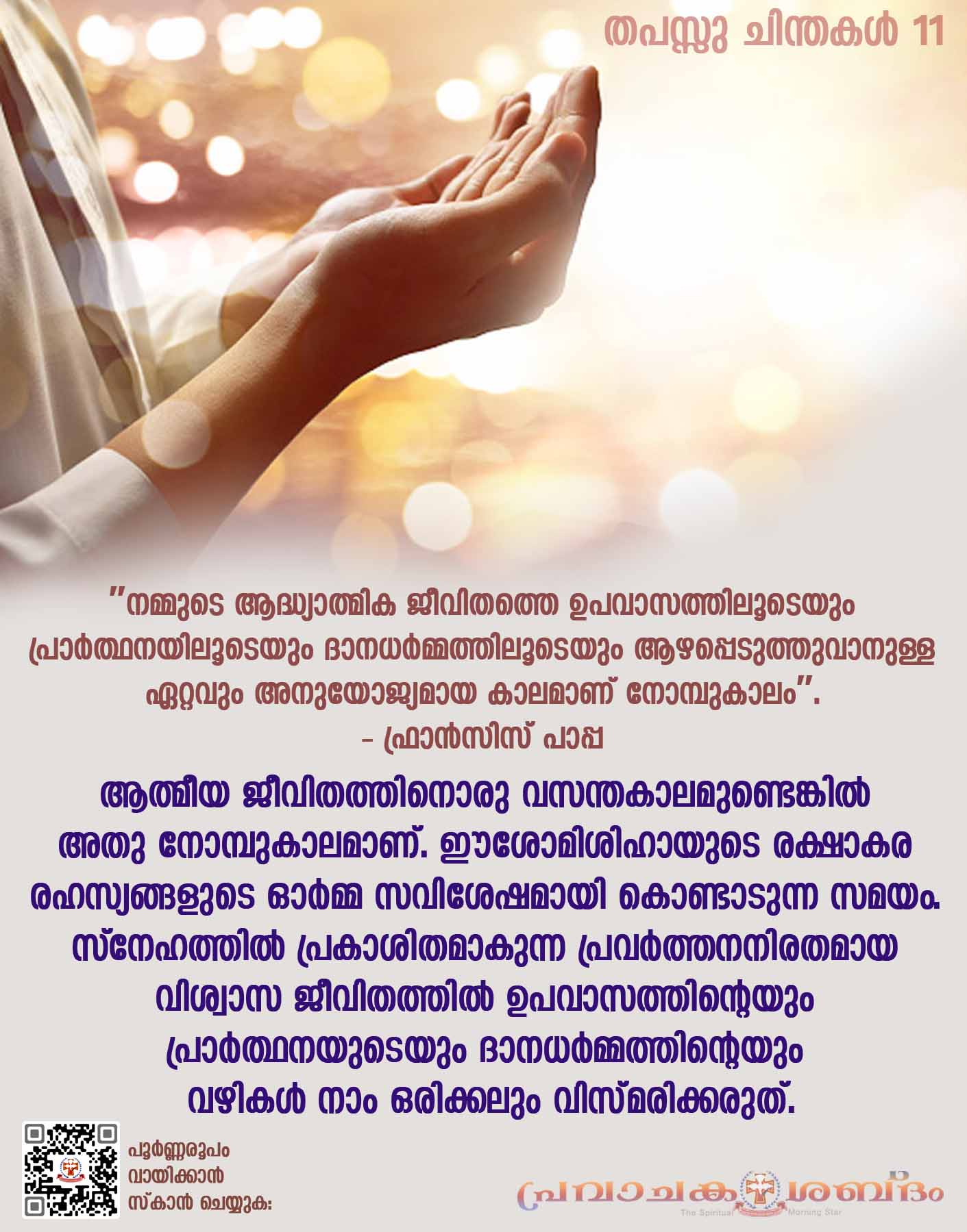 "നമ്മുടെ ആദ്ധ്യാത്മിക ജീവിതത്തെ ഉപവാസത്തിലൂടെയും പ്രാർത്ഥനയിലൂടെയും ദാനധർമ്മത്തിലൂടെയും ആഴപ്പെടുത്തുവാനുള്ള ഏറ്റവും അനുയോജ്യമായ കാലമാണ് നോമ്പുകാലം". - ഫ്രാൻസിസ് പാപ്പ.