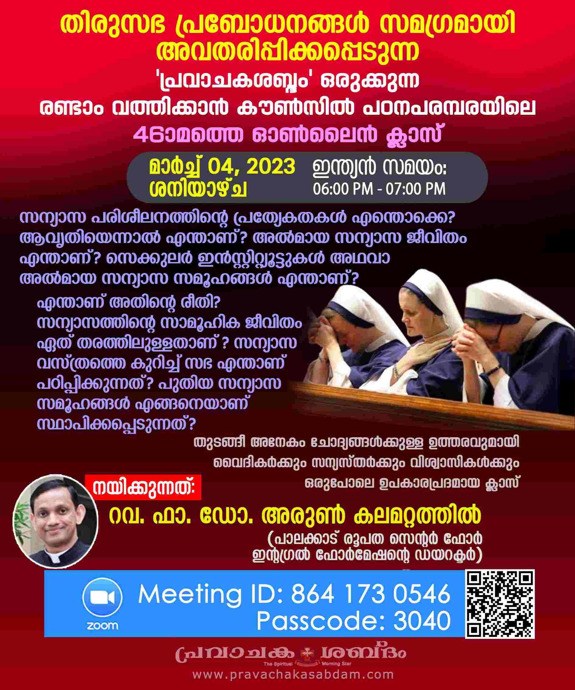 സന്യാസ പരിശീലനത്തിന്റെ പ്രത്യേകതകള് എന്തൊക്കെ? ആവൃതിയെന്നാല് എന്താണ്? അല്മായ സന്യാസ ജീവിതം എന്താണ്? സെക്കുലര് ഇന്സ്റ്റിറ്റ്യൂട്ടുകള് അഥവാ അല്മായ സന്യാസ സമൂഹങ്ങള് എന്താണ്? എന്താണ് അതിന്റെ രീതി? സന്യാസത്തിന്റെ സാമൂഹിക ജീവിതം ഏത് തരത്തിലുള്ളത്? സന്യാസ വസ്ത്രത്തെ കുറിച്ച് സഭ എന്താണ് പഠിപ്പിക്കുന്നത്? പുതിയ സന്യാസ സമൂഹങ്ങള് എങ്ങനെയാണ് സ്ഥാപിക്കപ്പെടുന്നത്? അതിന് എന്ത് മാനദണ്ഡമാണുള്ളത്? തുടങ്ങീ വിവിധങ്ങളായ ചോദ്യങ്ങള്ക്കുള്ള ഉത്തരം നാളത്തെ ക്ലാസില് പങ്കുവെയ്ക്കപ്പെടും. ക്ലാസിന് ഒരുക്കമായി ഇന്ത്യന് സമയം വൈകീട്ട് 05:25നു ജപമാല ആരംഭിക്കും.