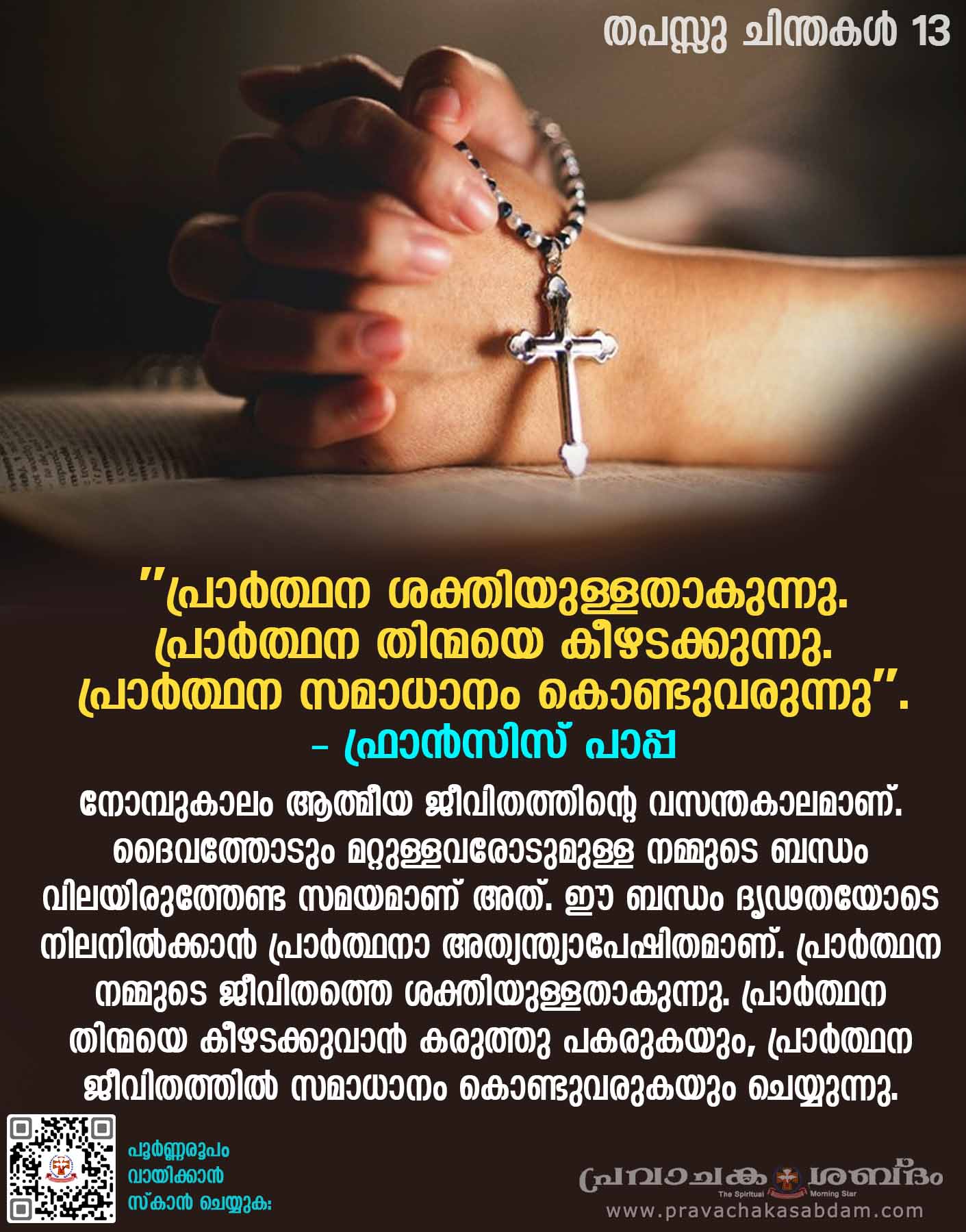 "പ്രാർത്ഥന ശക്തിയുള്ളതാകുന്നു. പ്രാർത്ഥന തിന്മയെ കീഴടക്കുന്നു. പ്രാർത്ഥന സമാധാനം കൊണ്ടുവരുന്നു". - ഫ്രാൻസിസ് പാപ്പ.